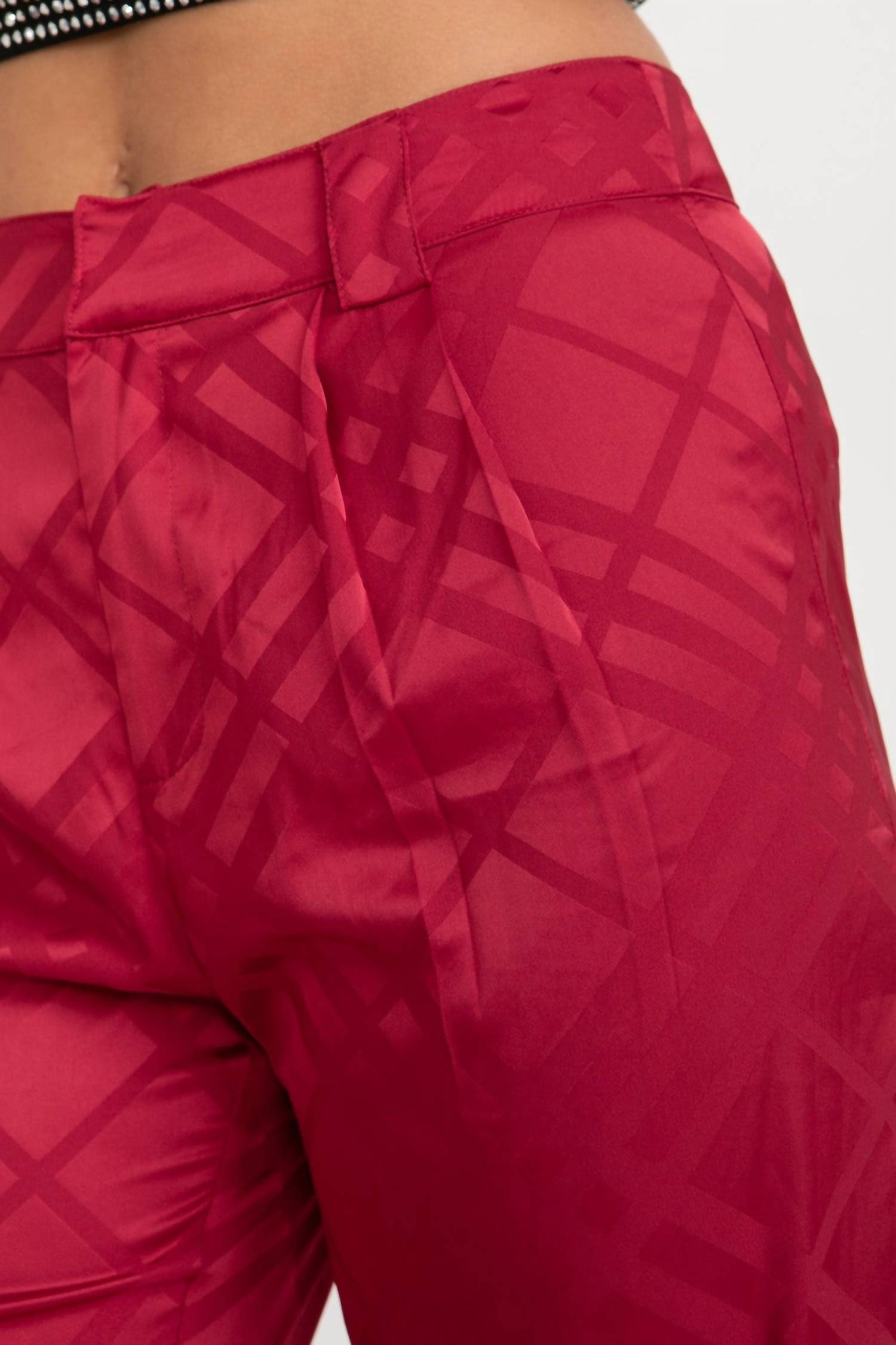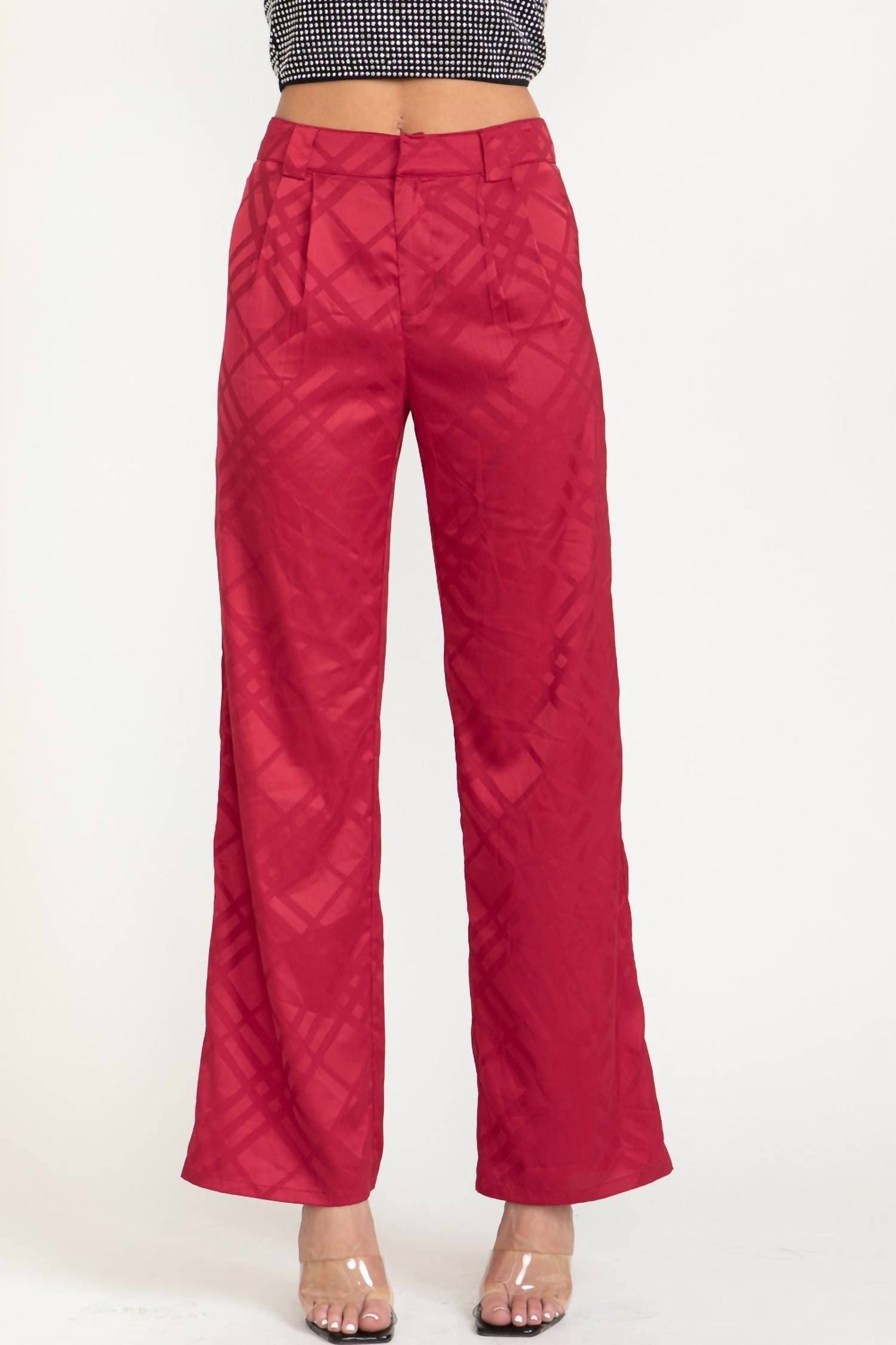 These holiday plaid satin pants feature a high rise with a front zipper and hook closure. They are made from 97% polyester and 3% spandex. The pants are not lined. Hand wash cold, dry flat or tumble dry.