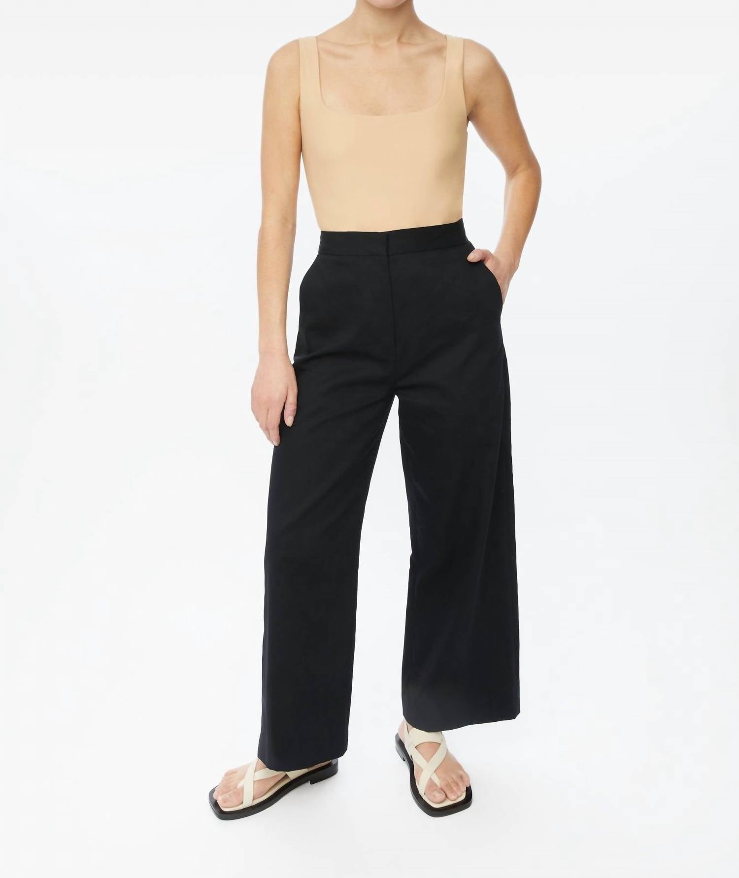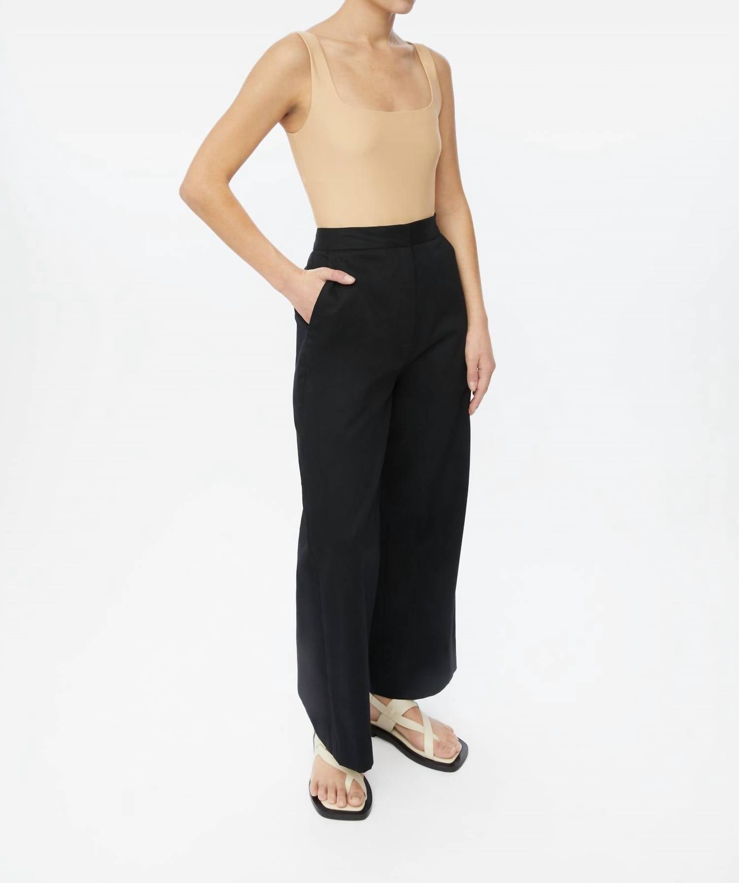 Elevate your wardrobe with Dāl the Label's Cotton Twill Pants in sleek black, perfect for versatile style. Crafted from 100% cotton, these wide-leg, cropped trousers offer breathability and comfort with a high-rise waist and side and back welt pockets, highlighted by elegant corozo buttons. The seamless finish is achieved with a concealed hook and zip closure at the front, creating a sleek silhouette for work or vacation. Care: Dry clean only.