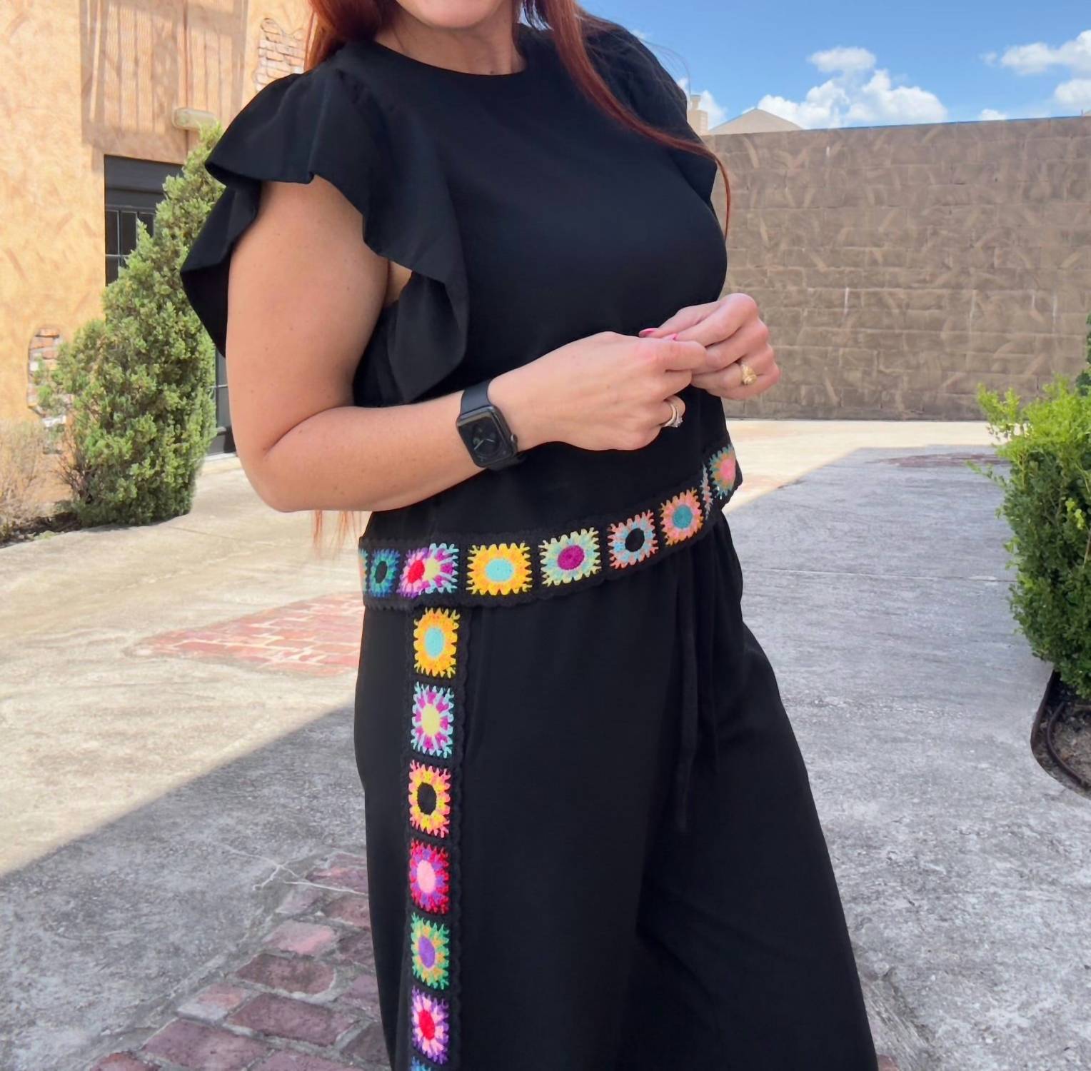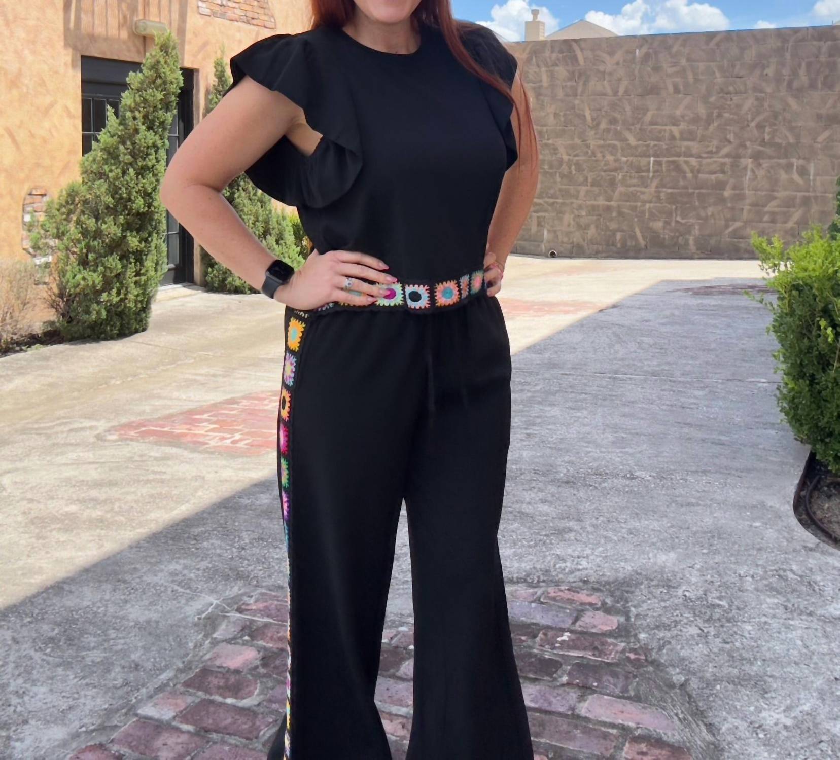 Embrace the retro elegance, offering a chic addition to any wardrobe. With a stylish patterned design in black, high-rise, wide-leg pants feature a convenient pull-on closure and boast a relaxed fit ideal for travel and boho chic occasions. Addition of pockets ensures practicality without sacrificing style. Crafted for autumn wear, care for these versatile knit pants by hand washing them to preserve their unique detailing.