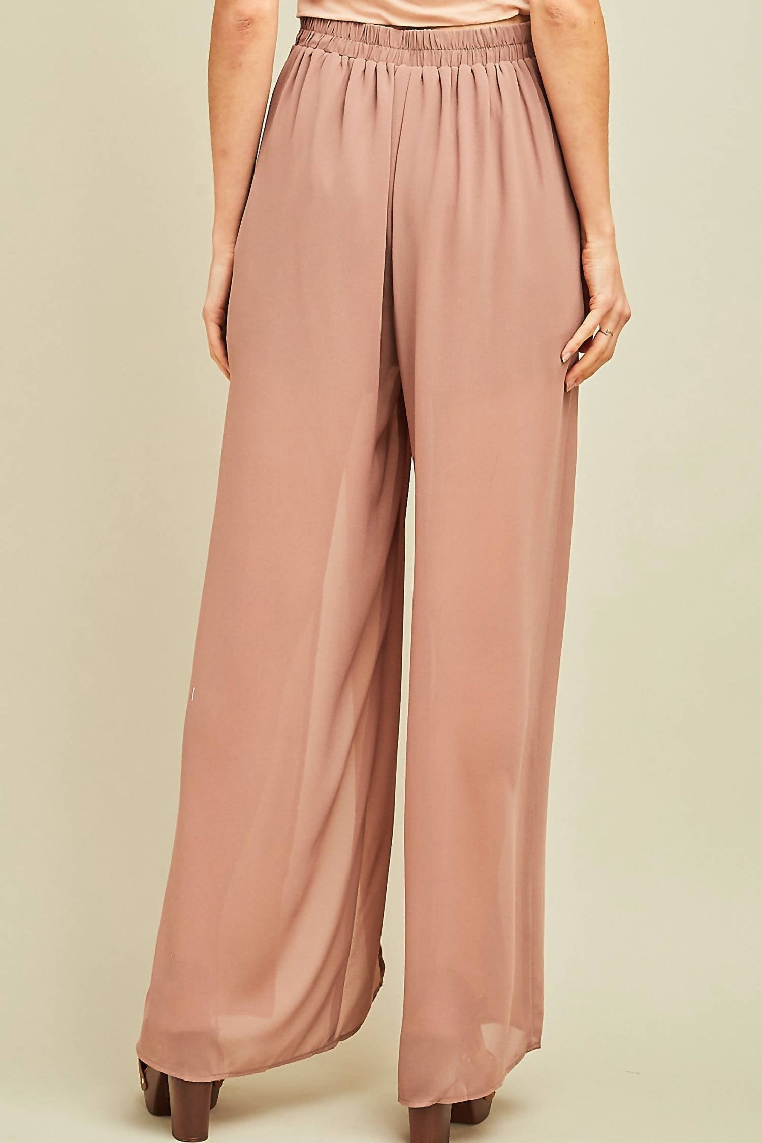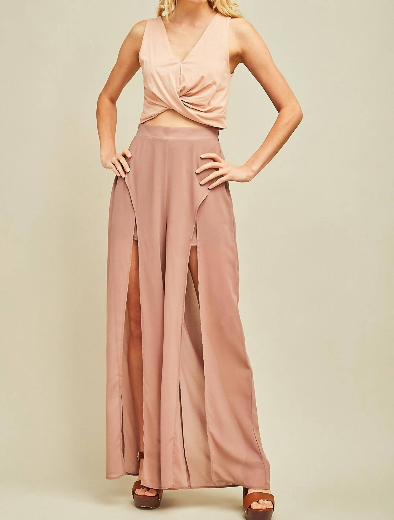 Elevate your date night ensemble with the Solid Slit Maxi Pants by Entro, presented in a chic latte color. These wide-leg pants feature a pull-on closure with a partially elastic waistband for added comfort and dramatic slits on the legs. Crafted from 100% lightweight polyester, they are conveniently lined with shorts. Care instructions recommend hand washing or opting for a dry clean.