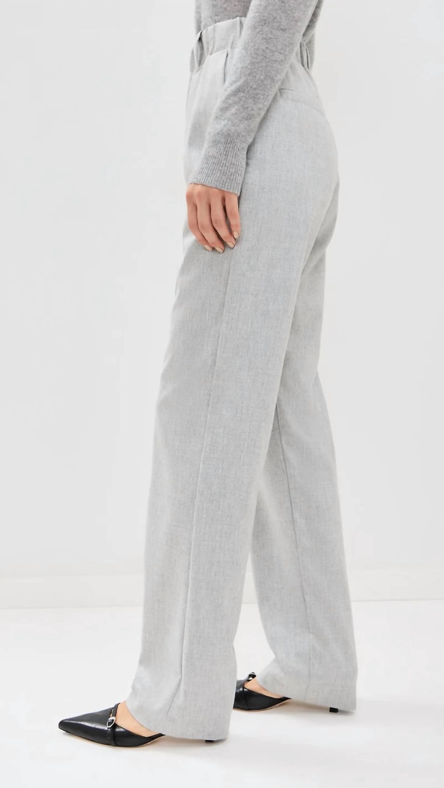 The Enza Costa Wool Pull On Trousers offer a refined yet minimalist appeal, perfect for a sophisticated dinner party. Designed with a high-rise fit and a straight leg, these trousers feature an elastic waistband for effortless pull-on styling. Crafted from a blend of 54% viscose, 27% polyester, 17% wool, and 2% lycra with a 100% cupro lining, they provide a comfortable and lightweight wear. The trousers are made in a solid grey hue and include practical 4-pocket styling. Care for these trousers with dry clean only. Product measurements for a size 1 include a 32" inseam and a 14" rise. Model in the first photo is wearing size 1 with measurements 5'7.5" height, 34.5" bust, 29" waist, and 38" hips.