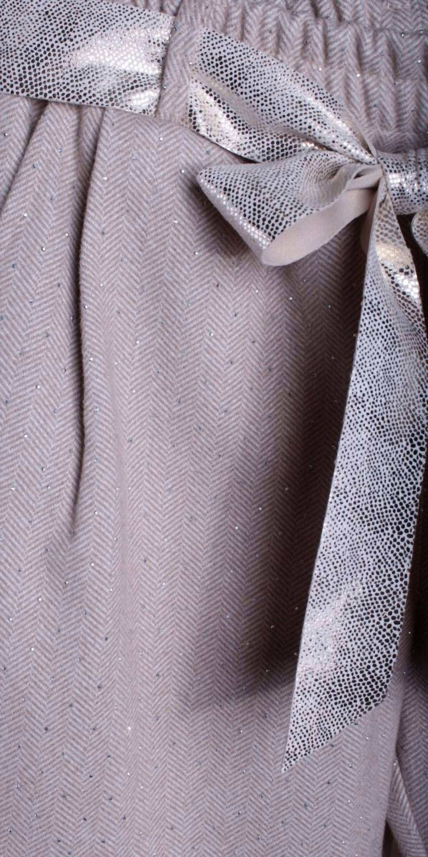 The perfect pant for running around town and looking cool while doing it. Elevate your casual wardrobe with the Gemma Jogger Pants by GIGI MODA, a stylish choice in taupe with a chic textured design. These women's knit blend joggers feature a pull-on elastic waistband complemented by a metallic tie belt, two convenient front pockets, and cuffed ankles. A subtle chevron print embellished with mini rhinestones adds a touch of sparkle to these pants. Made from a 60% polyester and 40% cotton blend in Italy, these joggers are available in one size and can be paired with the Gemma Jacket for a coordinated look. Model is 5'7".