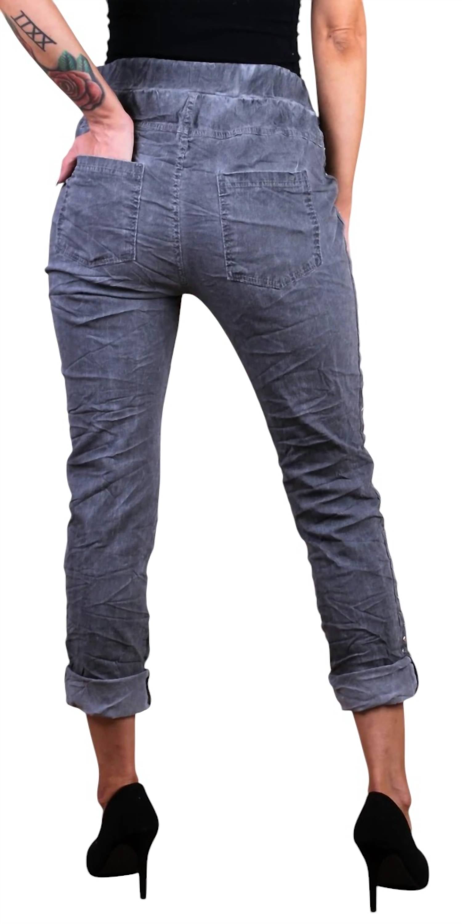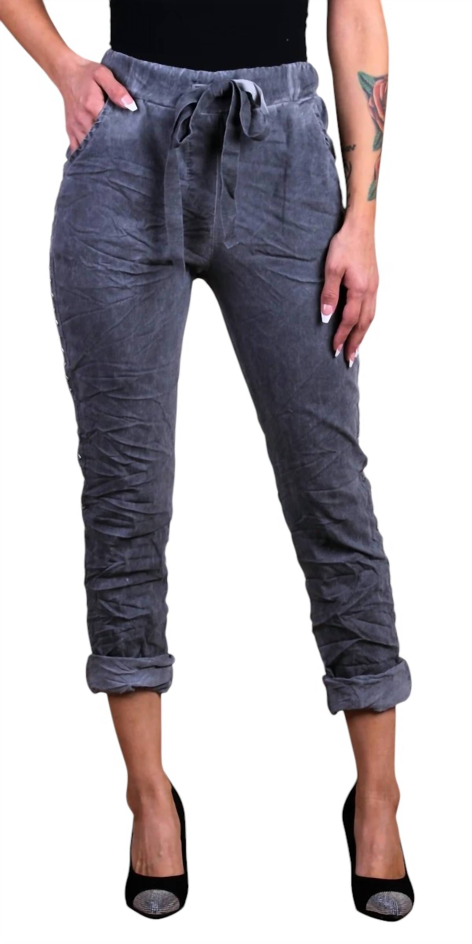 Elevate your streetwear style, perfect for travel and more. Cropped pants feature a trendy skinny leg and high-rise fit, accentuated by silver studded side stripes. Made in Italy from a comfy blend of 65% viscose, 30% nylon, and 5% elastane. Offer a pull-on convenience with functional pockets on both the front and back. Easy to maintain, simply machine wash to keep them looking fresh and fashionable. Model is 5'7" tall.