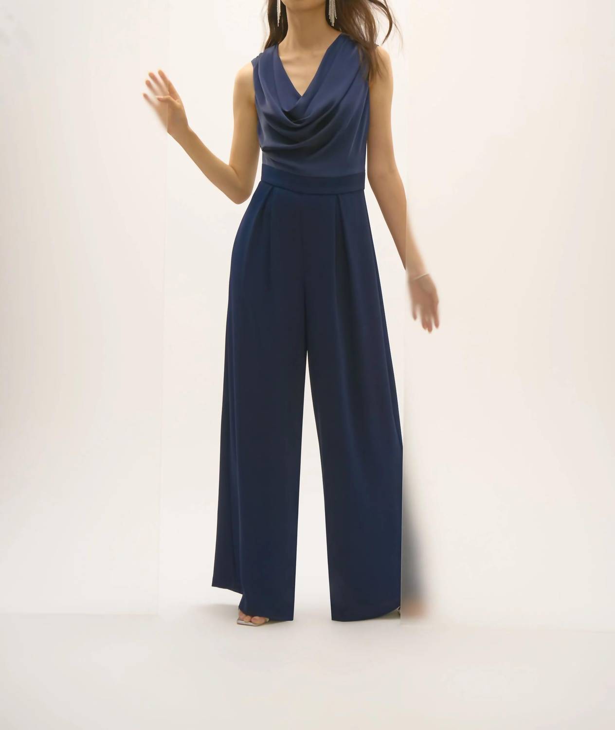 It doesn't take much for this one piece to look effortlessly cool. Add some statement jewelry to dress it up, or throw on some sneakers for a more casual vibe. The Joseph Ribkoff Cowl Neck Sleeveless Jumpsuit in Midnight Blue is a perfect blend of elegance and style for any sophisticated occasion. This chic full-length one-piece features a sumptuous polyester satin upper with a draped cowl neckline and a sleek, sleeveless design, exuding timeless appeal. Crafted in Canada, the jumpsuit showcases a wide-leg cut and pleated front, offering graceful movement, with a discreet back zipper ensuring a flattering fit. Care is simple with hand washing and line drying, making it both luxurious and practical for any wardrobe.