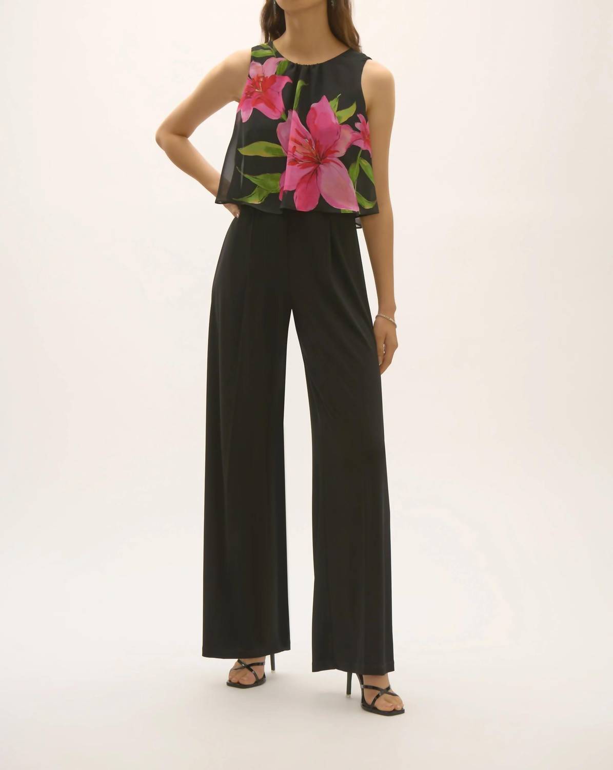 The Joseph Ribkoff Floral Chiffon Wide Leg Jumpsuit is an elegant choice for cocktail parties, offering a sleeveless design with a chic gathered crew neckline. Made in Canada, this jumpsuit combines a floral chiffon upper with silky knit pants for a flattering silhouette. Crafted from 96% Polyester and 4% Spandex, it features a back zip closure for a seamless fit. Care instructions recommend hand washing in cold water and hanging to dry in the shade for best results, ensuring longevity and maintaining its sophisticated look.