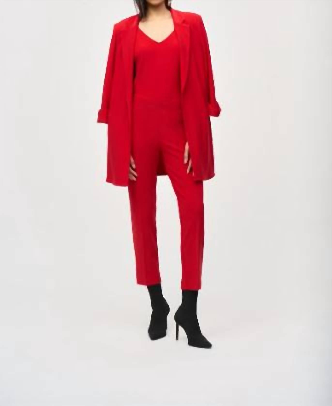 Upgrade your wardrobe with these cropped pants, designed to merge sophistication and wearability. The tailored fit ensures ultimate comfort during long days or nights out. Introducing the Lipstick Pant by Joseph Ribkoff, crafted for chic versatility in a bold shade. These women's pants offer a classic fit with a high-rise waist and straight leg style, perfect for both workwear and cocktail parties. Featuring a 29" garment length and a convenient pull-on closure. Made from 96% Polyester, 4% Spandex. These ankle and cropped pants promise comfort without sacrificing elegance. Care is to hand wash only.