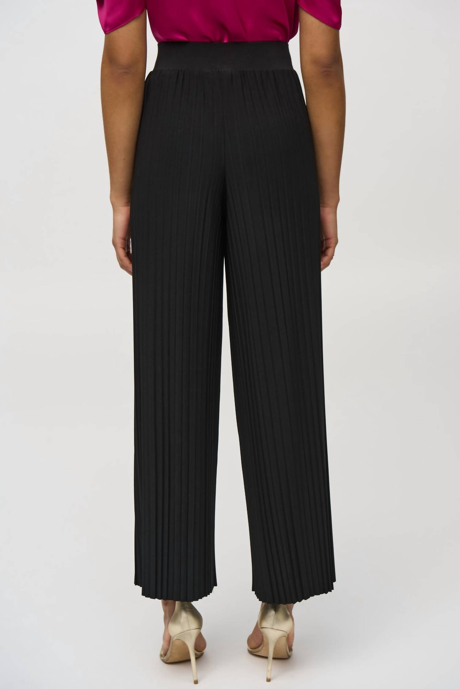 This straightleg pant is both stylish and comfortable. Did we mention the fit is perfection? Introducing the Joseph Ribkoff 244169 Black Pleated Wide Leg Pants, an elegant choice for any occasion. Featuring a high-rise, wide-leg silhouette, and a silky knit composition of 96% Polyester and 4% Spandex, these pants deliver a relaxed fit with a sophisticated touch. Designed with a covered elastic waistband and sash with a buckle, this pull-on style ensures comfort and a refined aesthetic. Measuring 39 inches in length, these pants are perfect for evening events and special occasions. Care: Hand wash in cold water with like colors and hang to dry in the shade. Model is 5'10" and wearing a size 6.