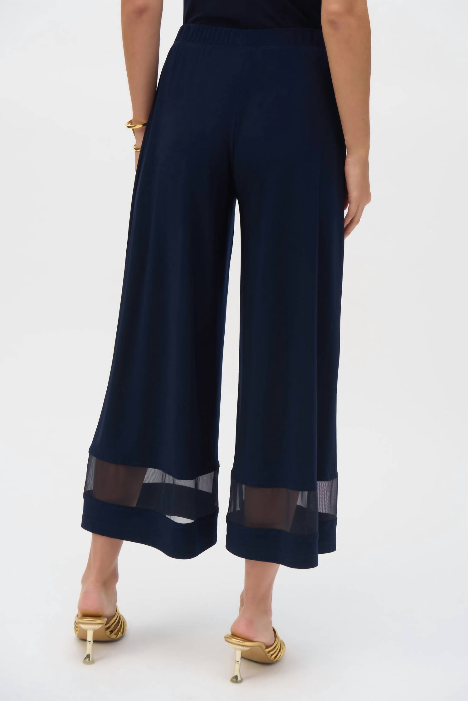 These silky knit pull-on pants balance comfort and elegance with a flowing culotte silhouette that moves gracefully with every step. A mesh insert at the hem adds a modern touch, while the elastic waistband ensures an effortless fit. Made of 96% polyester and 4% spandex.