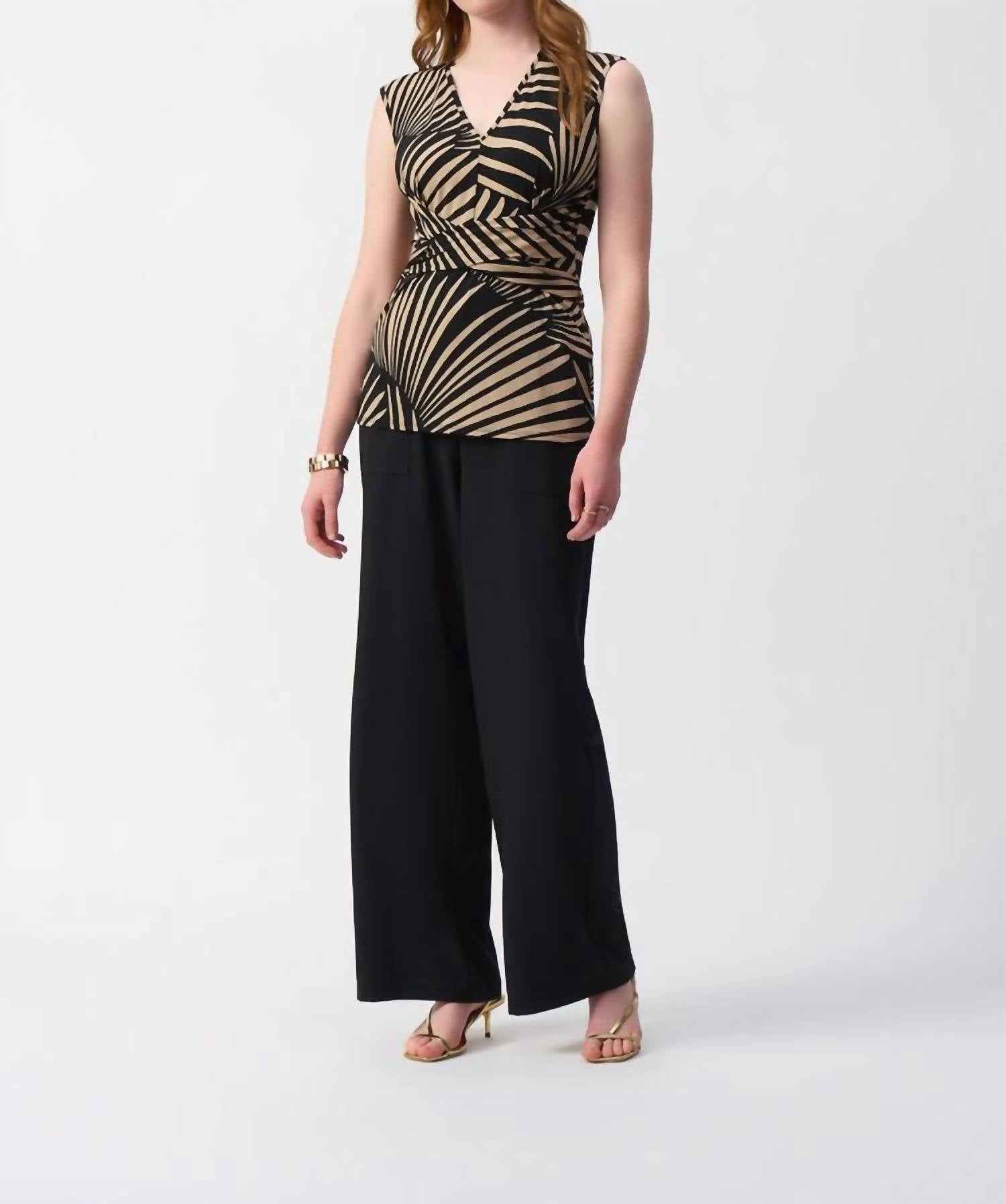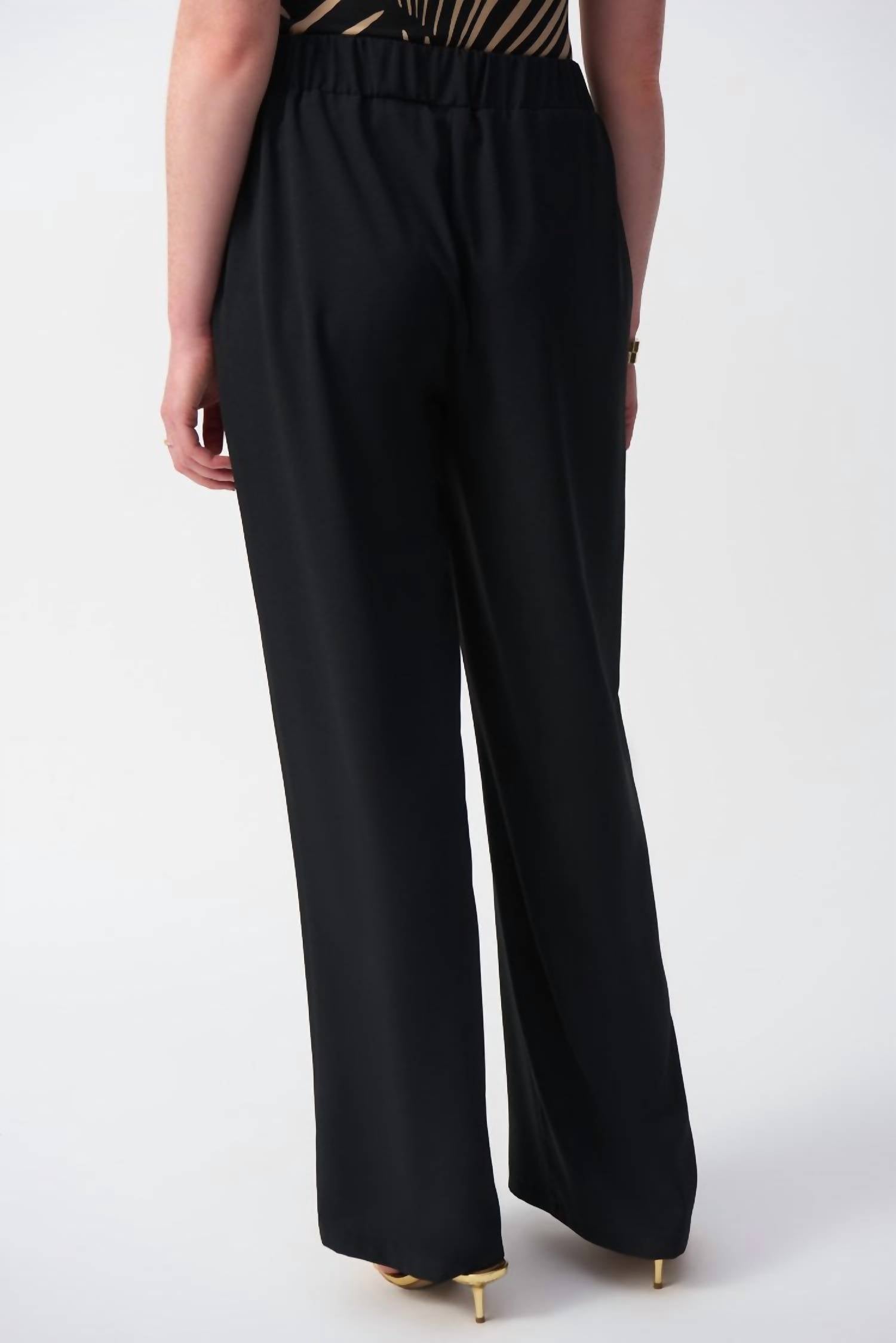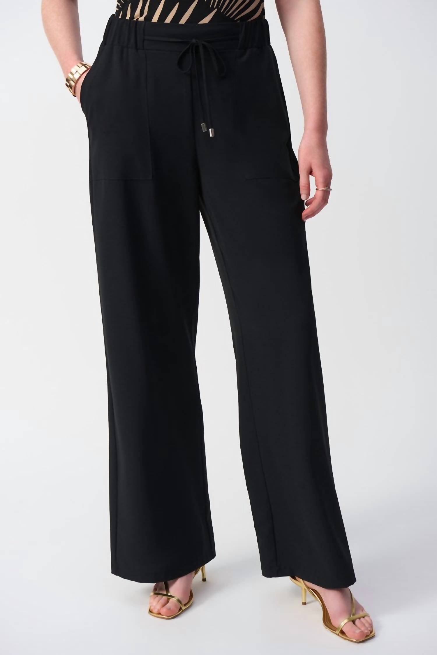 Elevate your style with the Textured Woven Wide Leg Pants by Joseph Ribkoff, crafted in timeless black to enhance your wardrobe. Tailored for a relaxed fit in luxurious 100% polyester, these wide-leg pants feature a sophisticated textured pattern. A pull-on closure with a shirred elastic waistband, accompanied by a chic spaghetti cord, ensures comfort and style. Designed with front-applied pockets, these pants demand attention and are ideal for holiday parties. Care: Hand wash and lay flat to dry.