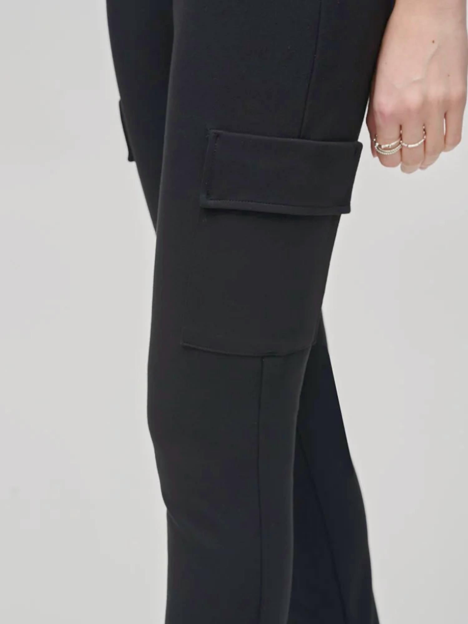 Enhance your wardrobe with the Joseph Ribkoff Women's Silky Knit Slim Fit Cargo Pants in sleek black. These chic trousers are crafted in 66% Viscose Rayon, 29% Nylon, and 5% Spandex, offering a heavy knit fabric that ensures both style and comfort. Designed with a pull-on closure, the pants feature a covered elastic waistband and multiple pockets, including cargo, side seam, and back pockets for a bold statement. Care is simple with hand wash in cold water and lay flat to dry instructions, ensuring versatility from office to cocktail hour.