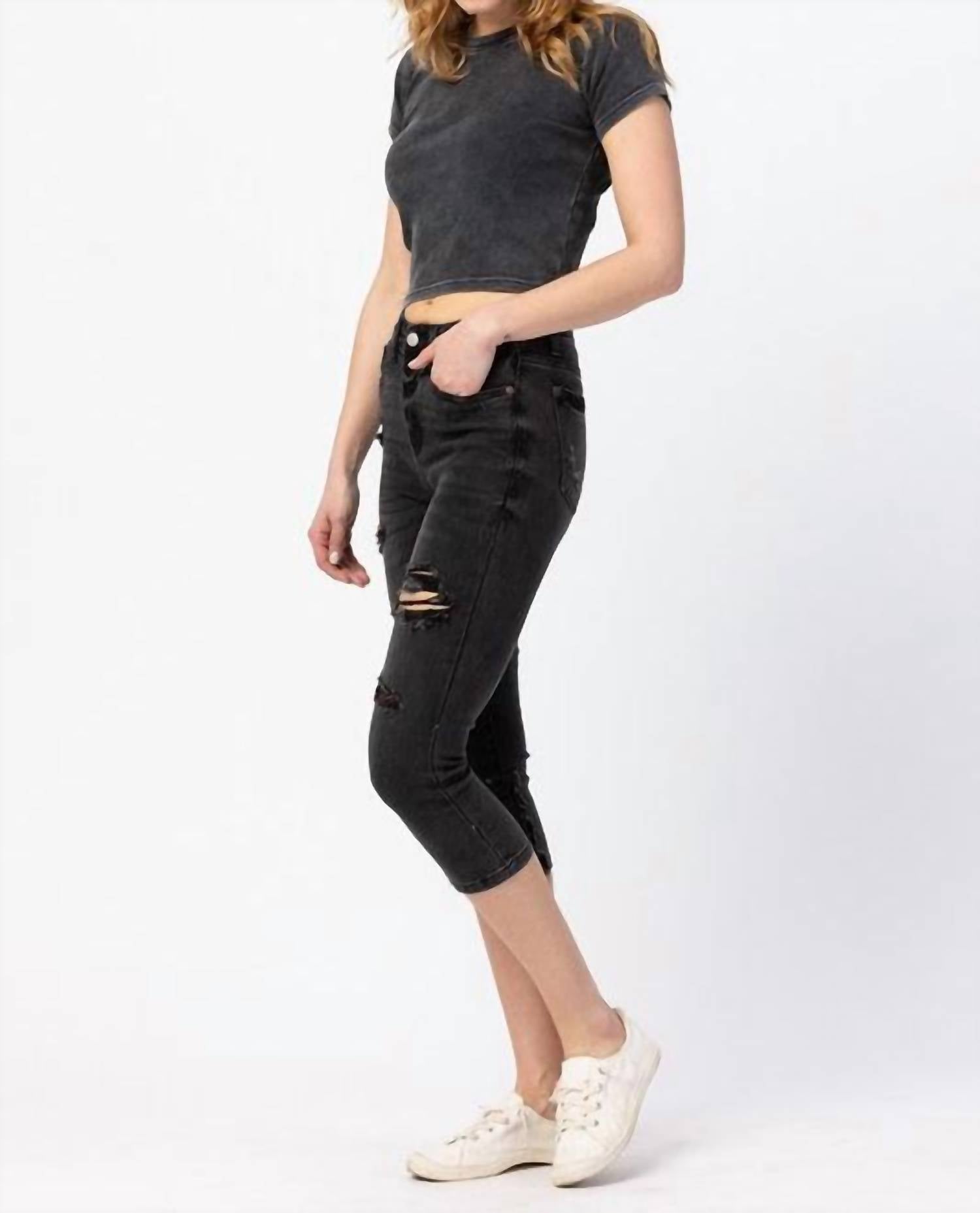 Wear these adorable capri pants with slides or cute flats for an effortlessly cool look. Elevate your spring wardrobe with the Vintage Capri Pants by Judy Blue, perfect for concerts and Fourth of July celebrations. Crafted from a cotton blend, these high-rise, slim-fit capris feature a solid black color for a classic look. Composition: 65% Cotton, 21% Rayon, 11% Polyester, 3% Spandex. The design includes a 10.5" rise and a 20" inseam, complemented by a zip closure and convenient pockets. Care: Machine wash.