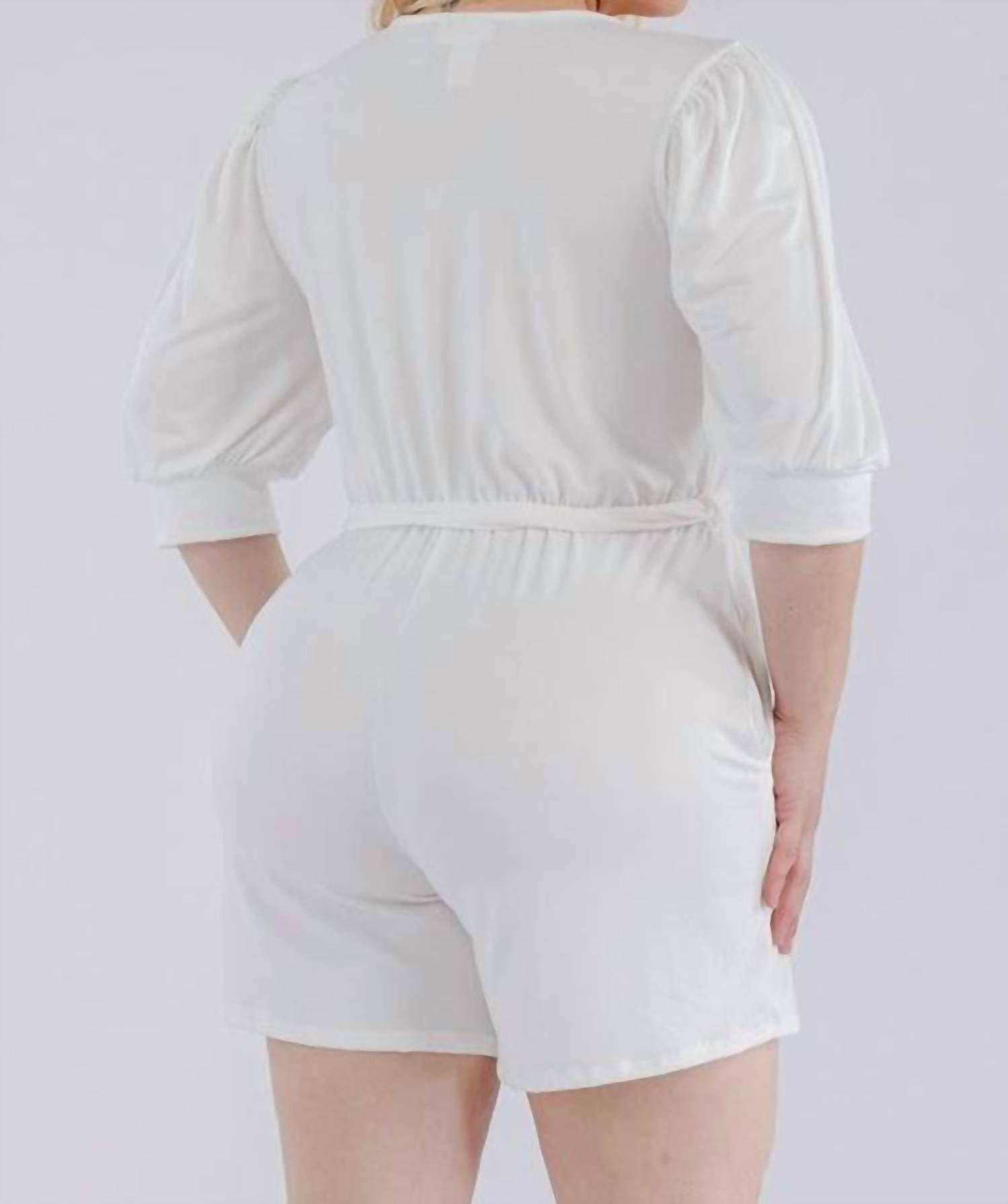 Throw it on and go! Embrace effortless style with the Tie-up Detailed Romper by Karen T Design, a chic choice for your summer wardrobe. This romper features 3/4 sleeves and a solid white design, offering both comfort and flair. Made from soft, stretchy polyester with pockets and a belt, it ensures a flattering fit with a convenient pull-on closure. Care instructions include machine wash, making it easy to maintain this wardrobe staple. Model is wearing size XL.
