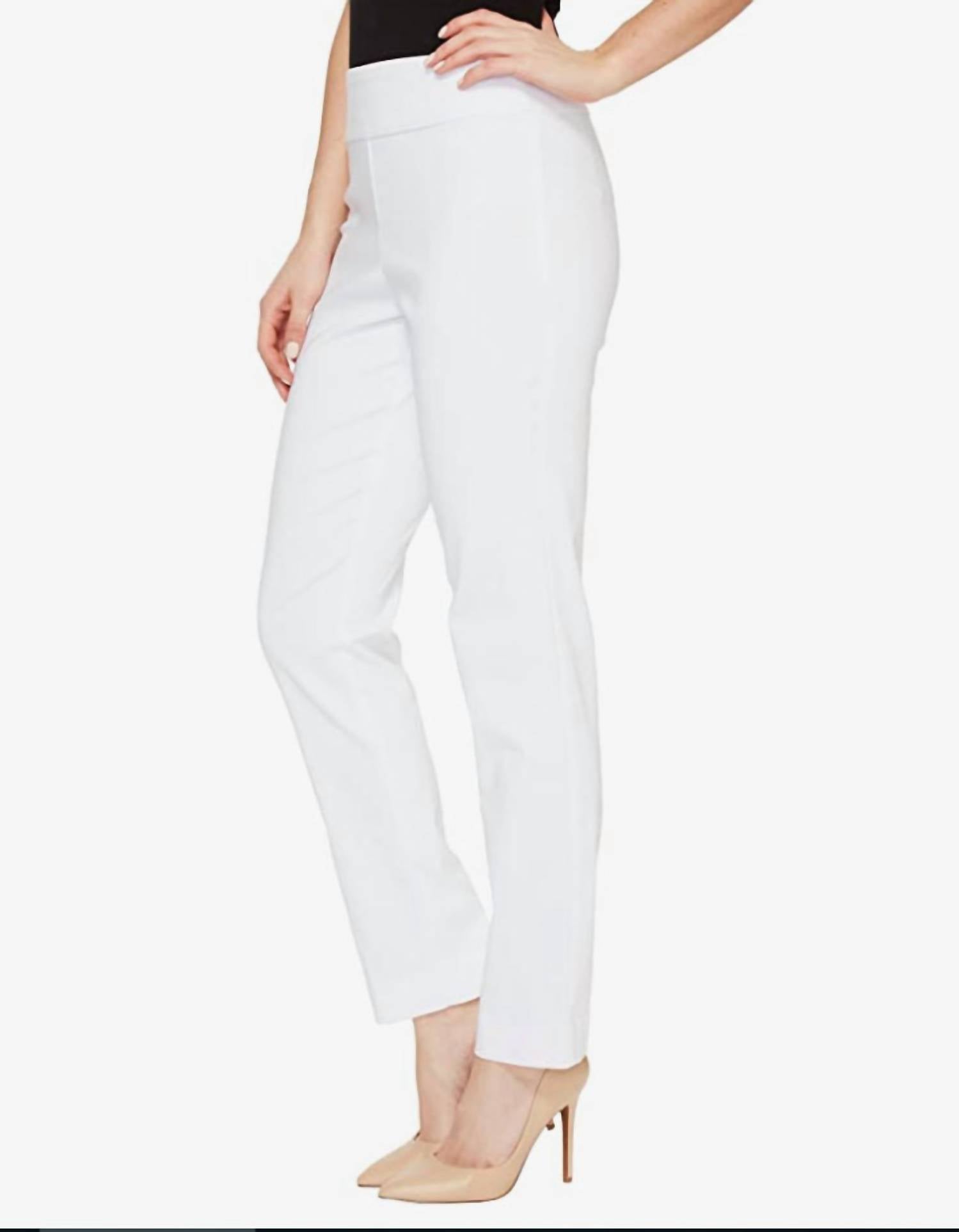 Enhance your wardrobe with this trendy cropped number, designed to blend style and practicality. The comfortable fit allows for easy all-day wear. The perfect length to pair with your favorite mules. Embrace minimalist elegance with the Krazy Larry Ankle Pant, a chic addition to your spring wardrobe in classic white. These slim fit, straight leg pants feature a convenient pull-on closure, offering both style and comfort with their nylon blend material. Designed with a mid-rise and a 28-inch inseam, they are perfect for a sleek silhouette, complete with functional pockets for practicality. Care is a breeze with machine wash and tumble dry instructions, making them ideal for a busy lifestyle.