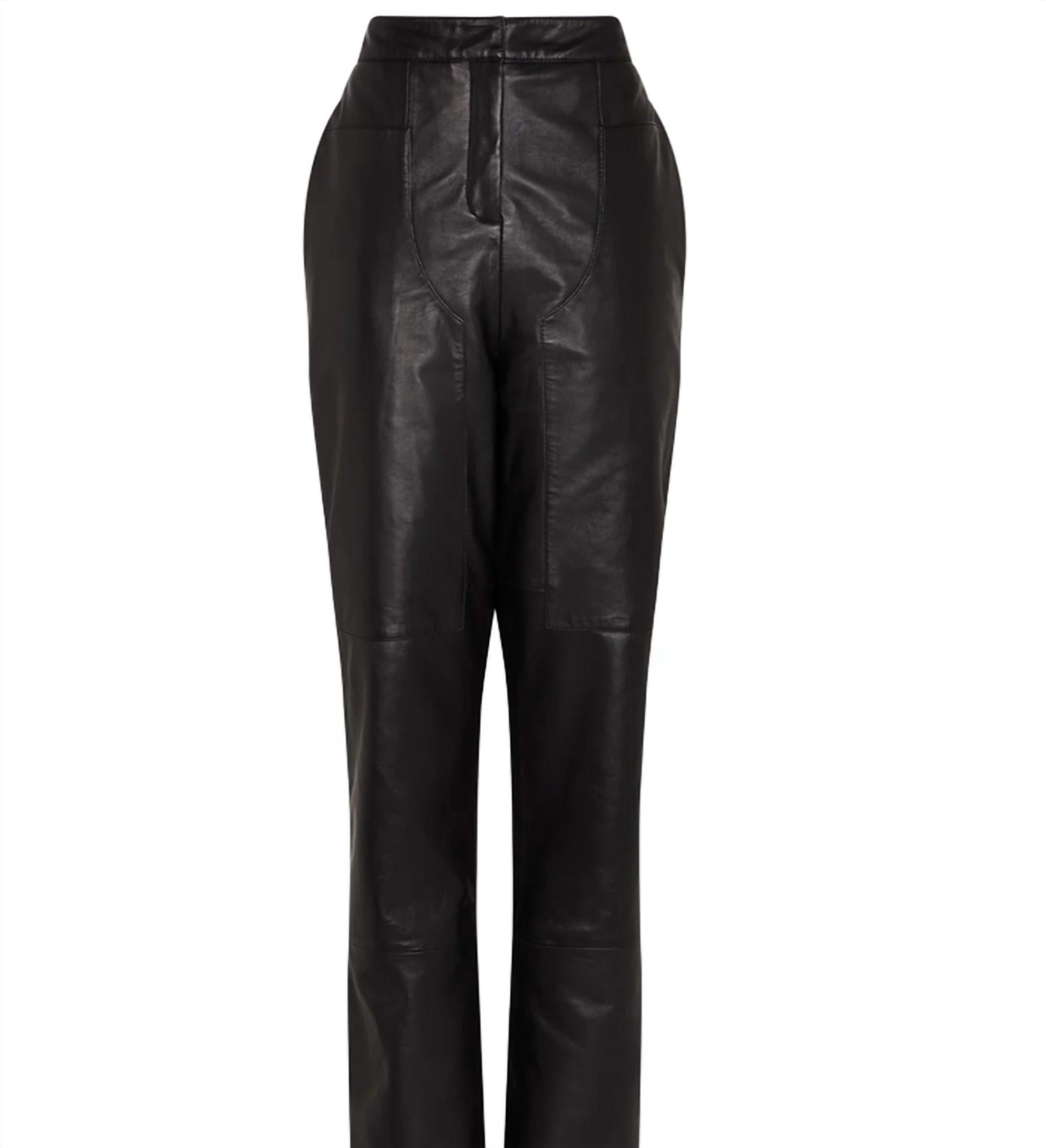 Introducing the Tia Leather Pant by Paris Georgia, crafted in luxurious black lamb leather. These trousers offer a timeless straight-leg silhouette and feature convenient side pockets, providing both style and functionality. Made from 100% lamb leather, they showcase the brand's commitment to quality. Proudly designed in New Zealand, these pants invite you to pair them elegantly with the matching Tia Leather Jacket for a complete chic look.