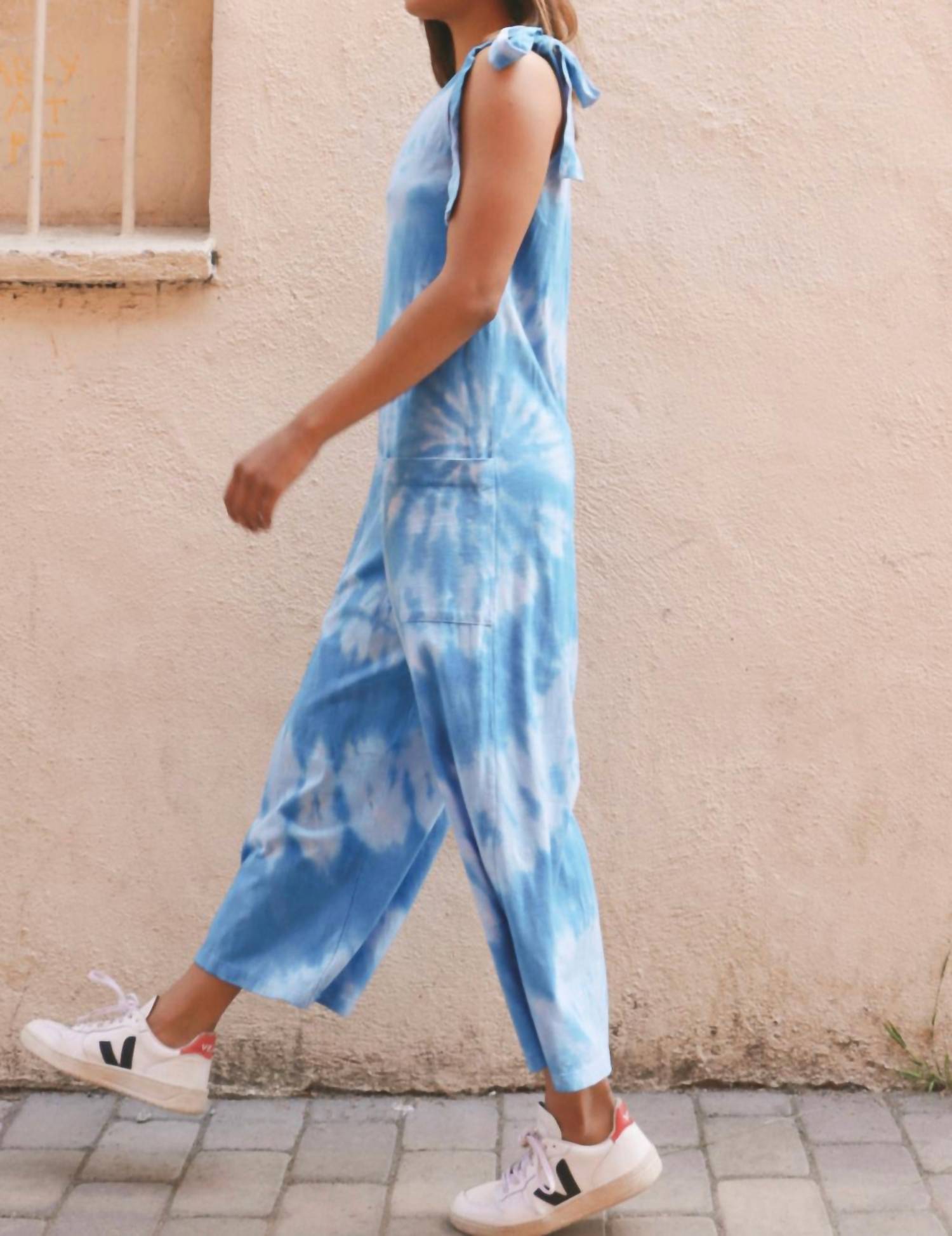 Throw it on and go! The Faye Jumpsuit Tie-dye by People of Leisure is a stylish, versatile addition to your summer wardrobe. Featuring wide legs, adjustable straps, and crafted from 100% organic cotton, this jumpsuit is made in Los Angeles, CA. The vibrant blue tie-dye pattern makes it perfect for casual outings or as a beach day cover-up. Easily cared for with a machine wash and tumble dry on low, it includes pockets for added convenience. Available in sizes S-XL, the model is wearing a size small.