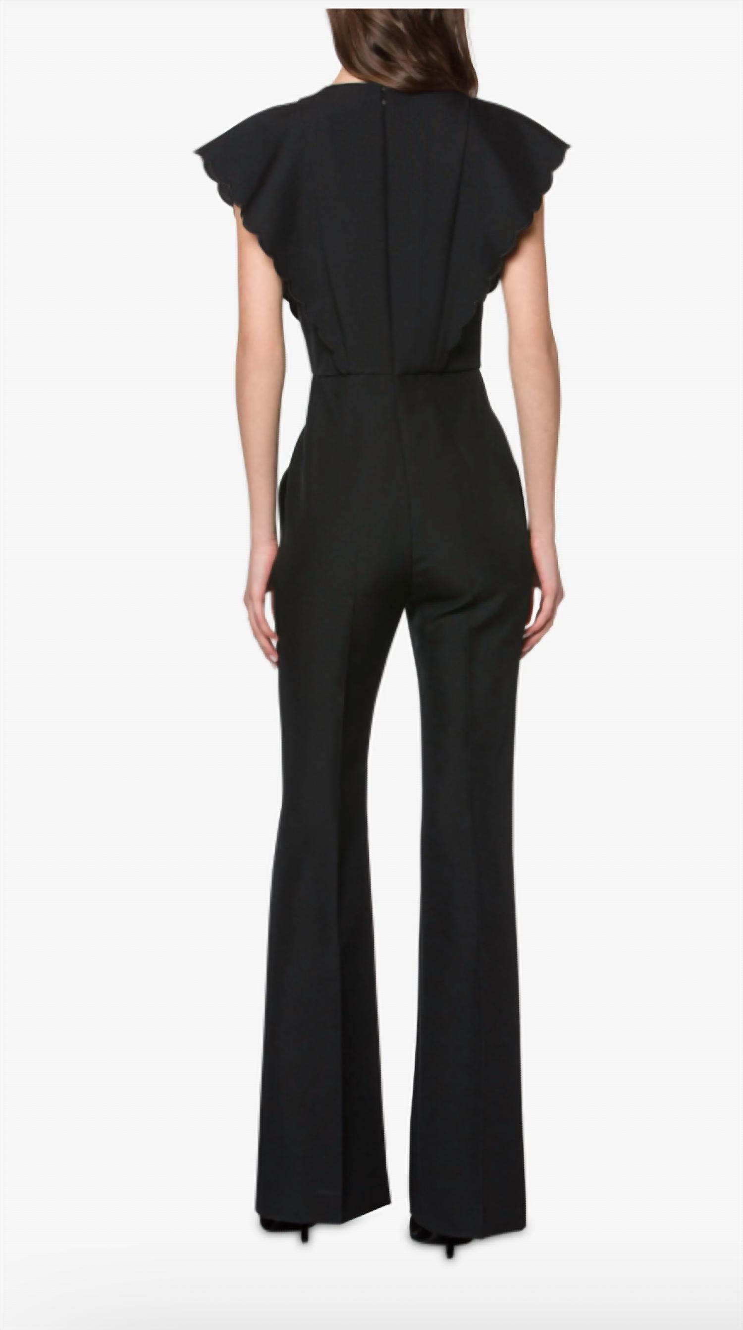 Stay on trend with these stylish boot cut pants that are fit to perfection. The perfect combination of comfort and fashion, you'll be grabbing for these all season long! Technical grain de poudre jumpsuit with a tailored feminine look and deep V-neck. Flare line of the trousers. Fitted at the waist, while it falls more softly at the hips. 100% Polyester.
