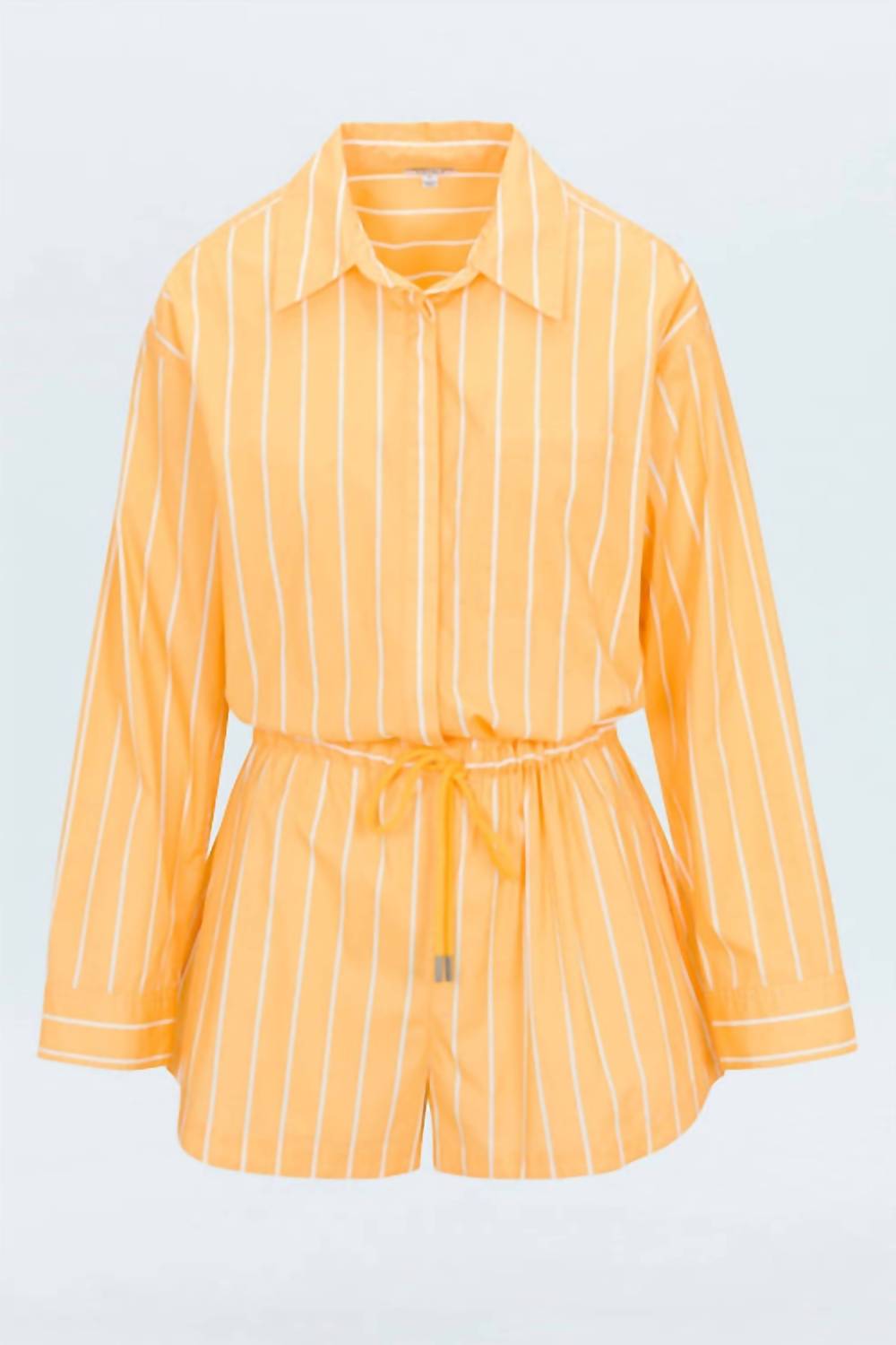 The perfect outfit choice when you you need something quick to throw on and still want to look efforlessly cool. Meet the Amelie Cotton Poplin Romper by PISTOLA, a perfect addition to your wardrobe for sunny spring days. Crafted from a cotton blend, this romper features a relaxed fit with a classic collared neckline, button closure, and adjustable drawstring waist for a tailored fit. Its eye-catching Papaya Stripe print combines sunshine yellow with crisp white pinstripes, adding a playful touch to your ensemble. Designed for travel and leisurely pleasures, it's machine washable and should be laid flat to dry.