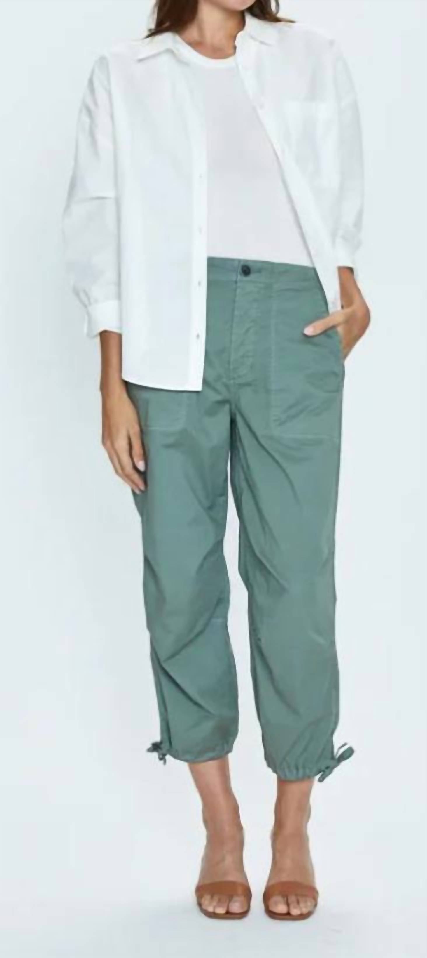 The perfect casually cool capri pant. Pull the ripcord. Parachute inspired trouser crafted from a lightweight stretch fabric. Designed with exposed front patch pockets and a cropped length finished with adjustable, self tie bands. Olivine is an elevated shade of green that dresses up and down with ease. 98% Cotton / 2% Spandex Wash Cold