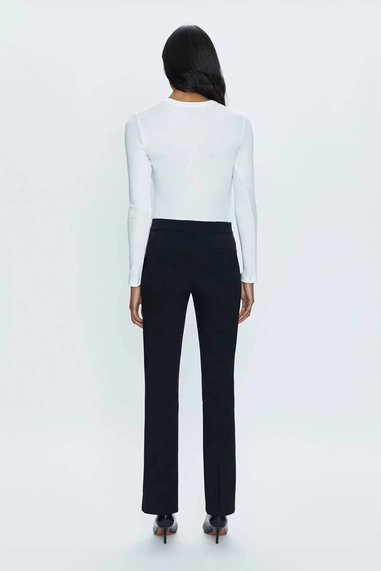 The Diana Front Slit Trouser by PISTOLA is your go-to piece for the holiday season, offering a chic, tailored fit in classic black. Featuring a mid-rise straight leg silhouette, these trousers boast pintuck seam detailing that leads to a stylish open front slit at the ankles, perfect for showcasing your favorite ankle boots or strappy heels. Crafted from a blend of 76% Polyester, 19% Rayon, and 5% Spandex with a convenient zip closure, these trousers combine comfort and sophistication effortlessly. Care instructions include machine wash and tumble dry to ensure ease of maintenance.