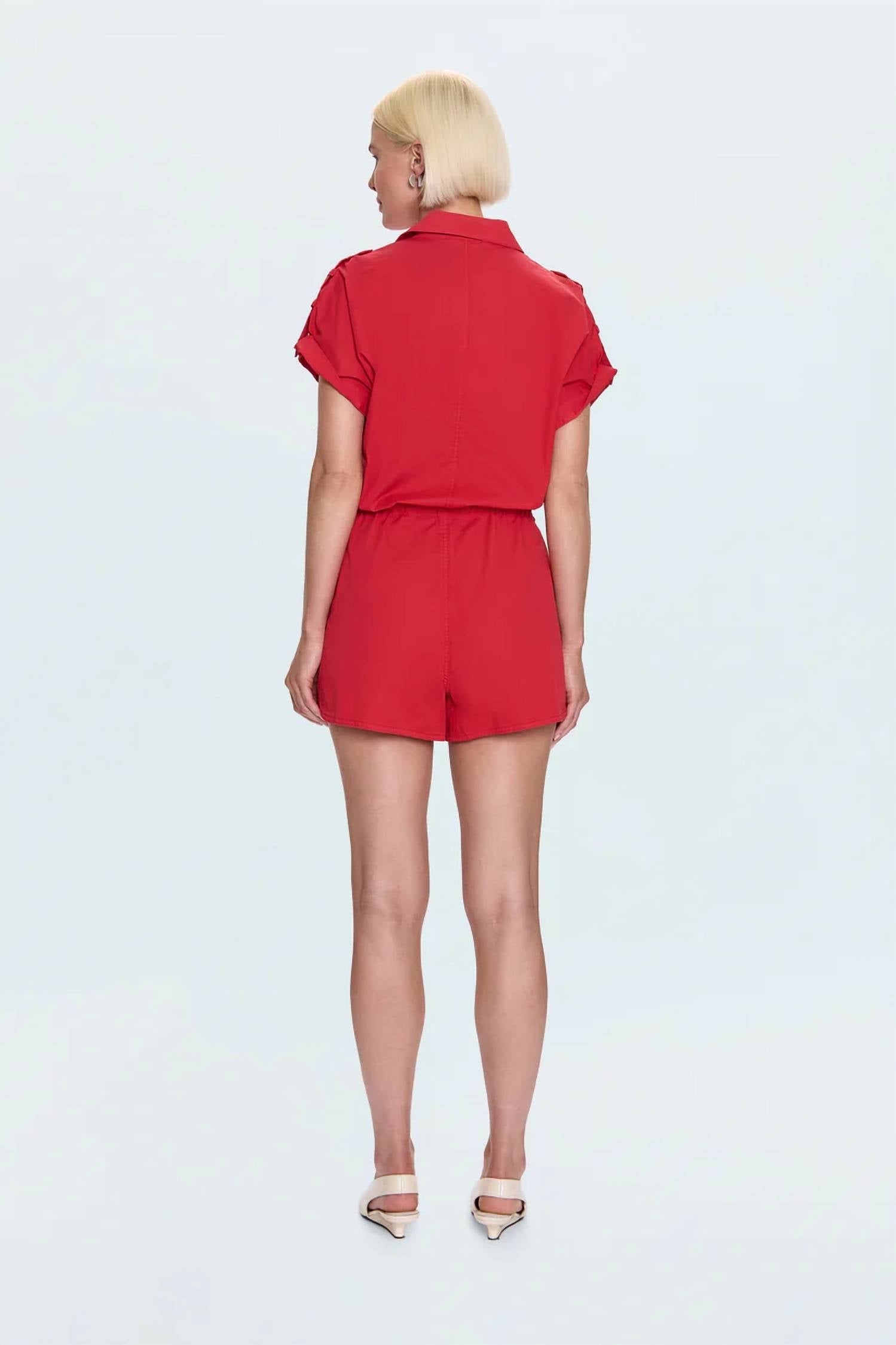 Meet the Meg Short Sleeve Zip Front Romper by PISTOLA, crafted in a luxurious cotton blend. Featuring short sleeves, this romper offers a flattering fit with a zipper front closure and a convenient drawstring waist. Made with 98% Cotton and 2% Spandex, ensuring comfort with a touch of stretch, and designed with an inseam of 3" and a leg opening of 27". Imported with care instructions to machine wash cold, this ruby red piece is a perfect travel companion for your summer getaways.