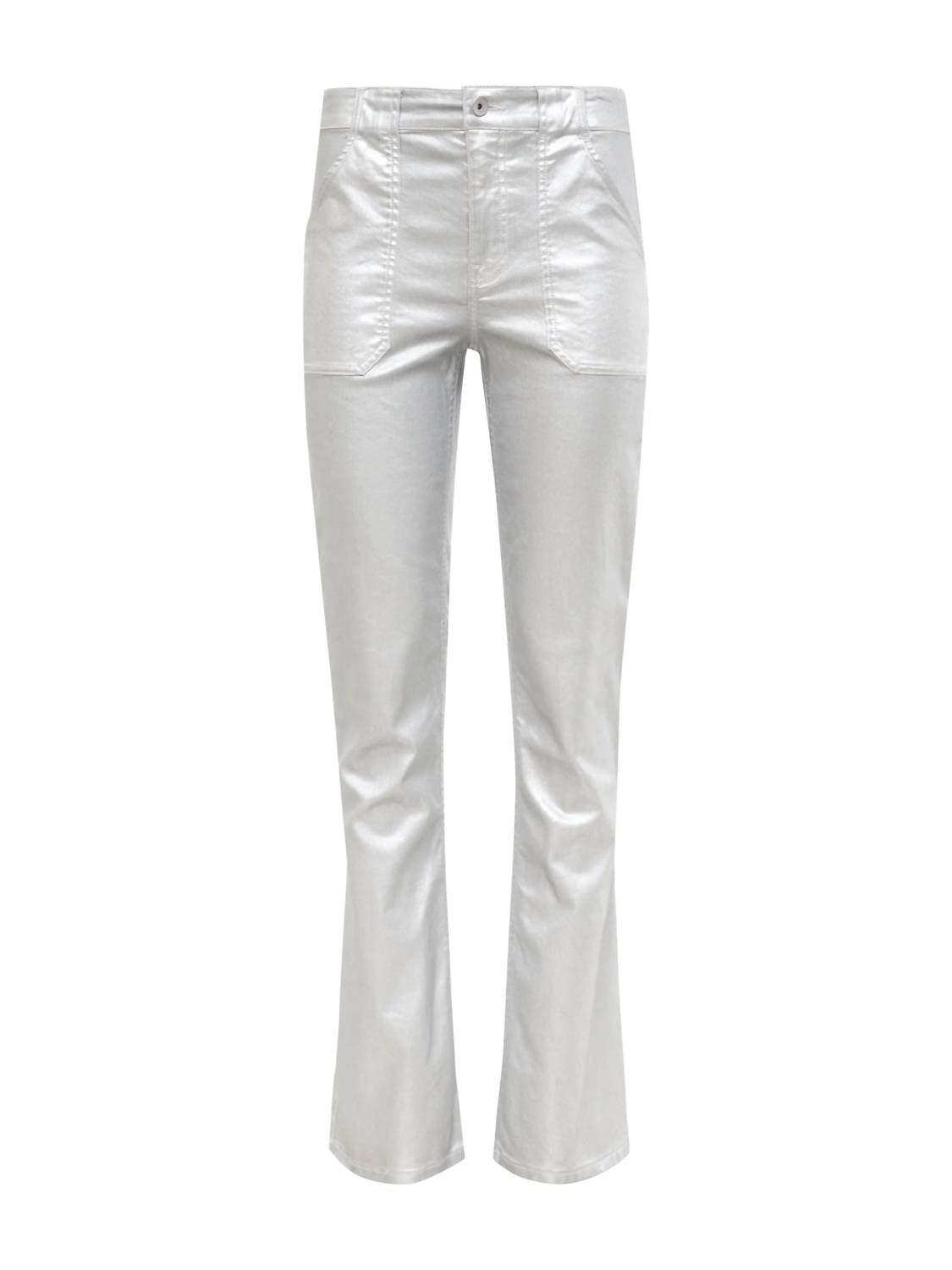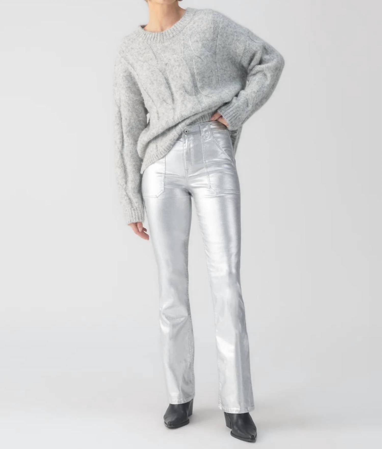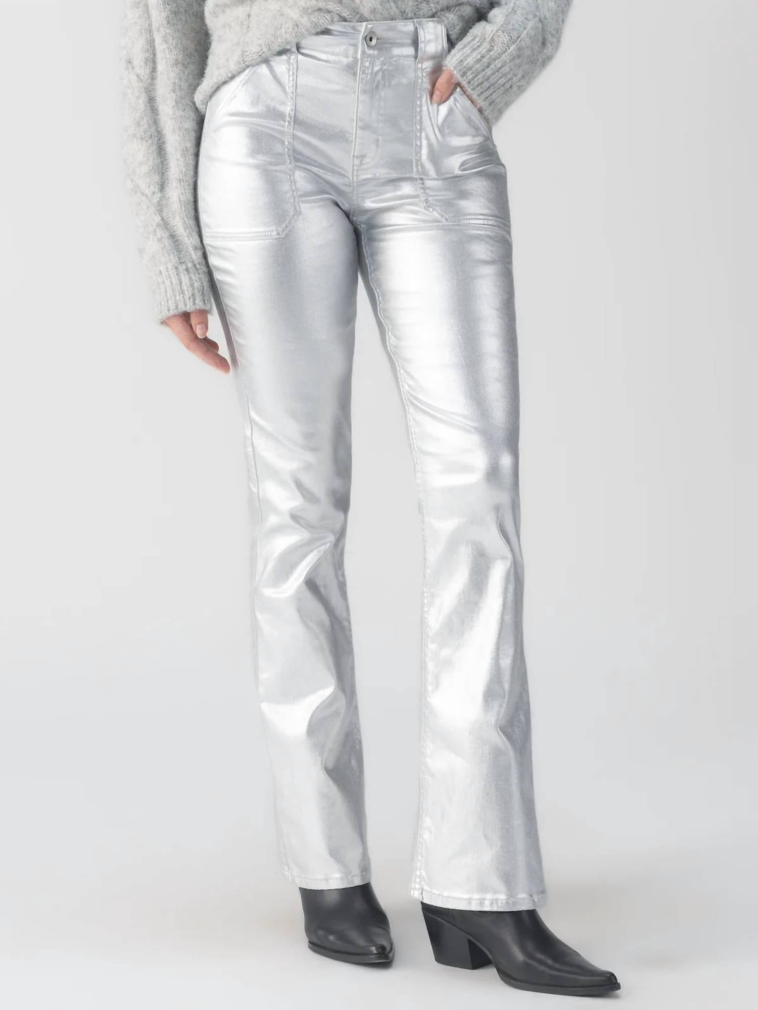 Stay on trend with these stylish boot cut pants that are fit to perfection. The perfect combination of comfort and fashion, you'll be grabbing for these all season long! Step into 90s fashion with the Sanctuary Metallic Hayden Bootcut Pant in a standout silver hue. Designed with an easy elastic back waist and a mid-rise fit, these pants offer both style and comfort. They are crafted from a cotton blend and boast front slant and back slip pockets, complemented by a button closure. Dimensions include a 28" waist, 10” front rise, 33.5” inseam, and an 18” leg opening. Care: Machine wash and tumble dry. Model is 5'8" and wearing a size 27.