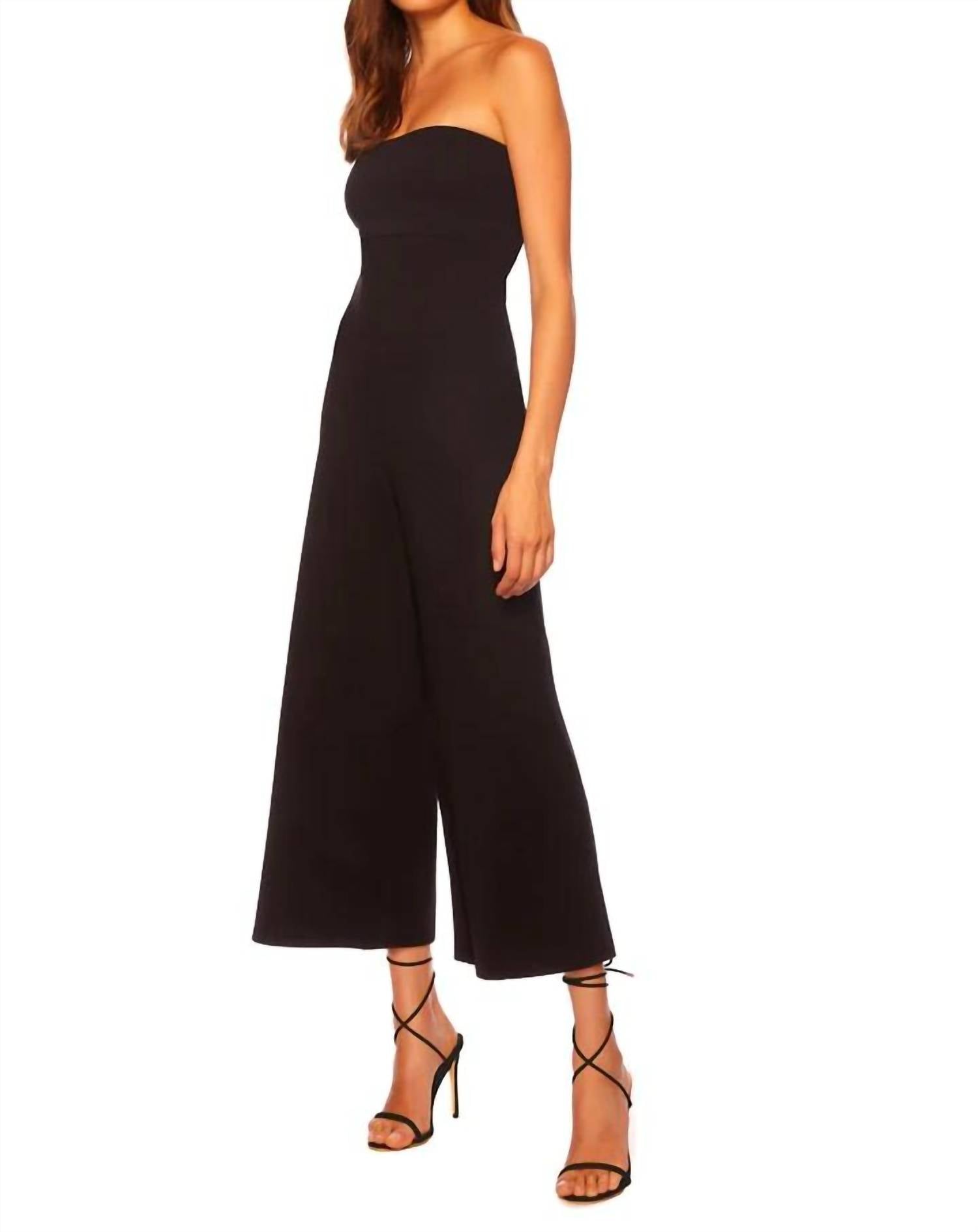 Introducing the Essential Tube Cropped Jumpsuit by Susana Monaco, a versatile piece in chic black that seamlessly transitions from day to night. Designed with a strapless tube neckline and a relaxed-fit wide-leg silhouette, this jumpsuit features a 24-inch inseam for a flattering midi length. Crafted from VISTA™ signature comfort stretch fabric, it consists of 90% nylon and 10% spandex, offering both style and comfort. Closure: Pull on. Care: Machine washable, follow care instructions. Model is 5'11" and wearing size S.