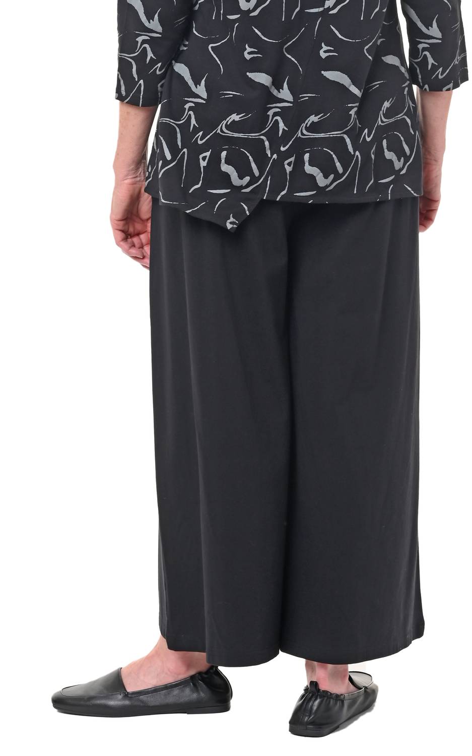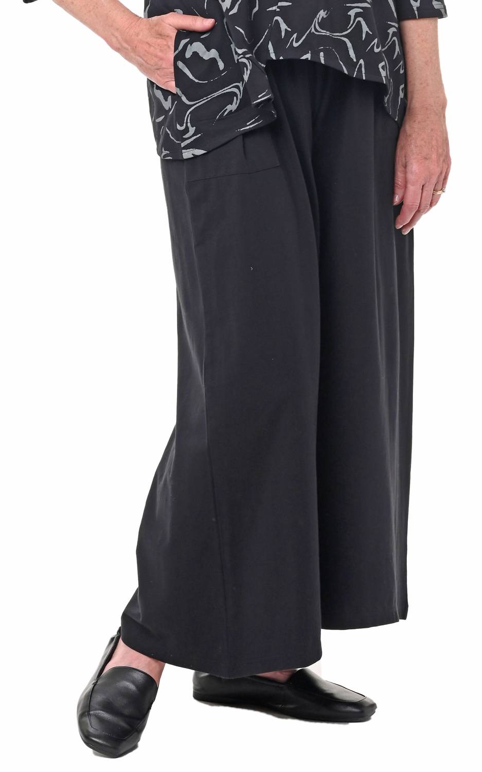 Stay on-trend and showcase your impeccable taste with these adaptable and stylish cropped pants. The perfect length to wear with your favorite mules. You'll love the fit! Introducing the Ariella Pant by Tulip Clothing, a perfect blend of comfort and style in classic black. These ankle-length, wide-leg pants feature a flat-front and an elastic back waistband with a side button closure for effortless wear. Crafted from 95% cotton and 5% spandex, they offer a comfortable fit with an inseam of 27". The decorative patch pocket adds a touch of flair, and the pants are easy to care for with machine wash and line dry instructions. Model is wearing a size small.