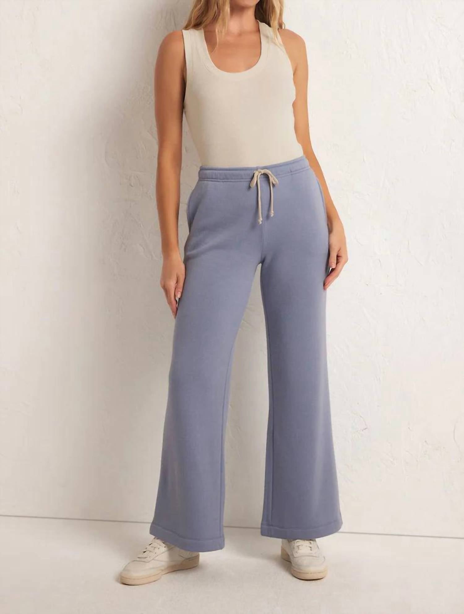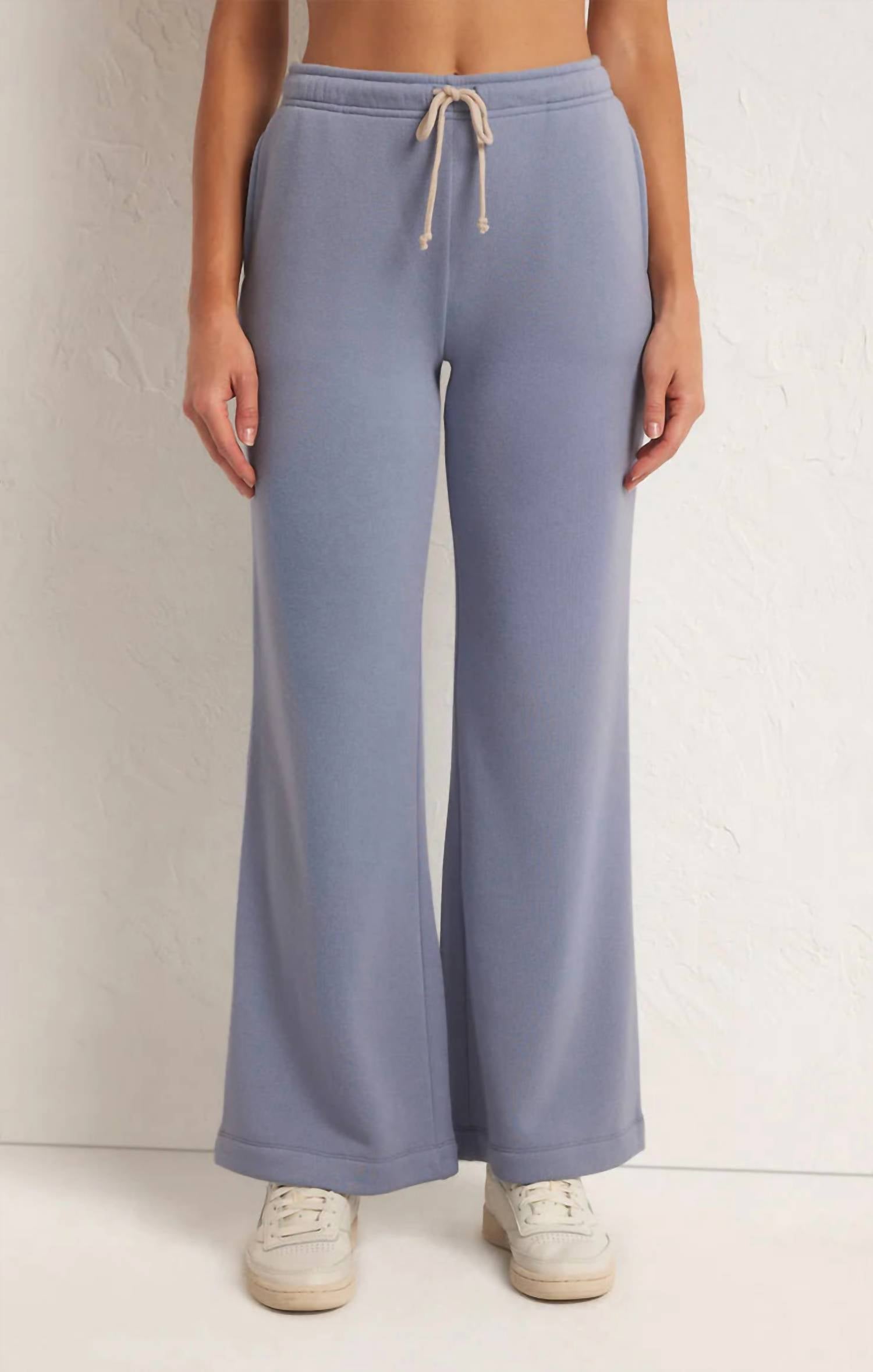 Trade in those tired old sweats for the Feeling The Moment Sweatpants by Z Supply, where comfort meets style. Crafted from a cozy reverse fleece made of 60% cotton, 28% polyester, and 12% rayon, these stormy-colored pants offer a relaxed fit with a wide leg design. Featuring a high-rise elastic waistband with an adjustable drawcord tie closure, these mid-weight trousers are perfect for your athleisure wardrobe. Easy to care for, simply machine wash cold, hang to dry, and cool iron if needed.