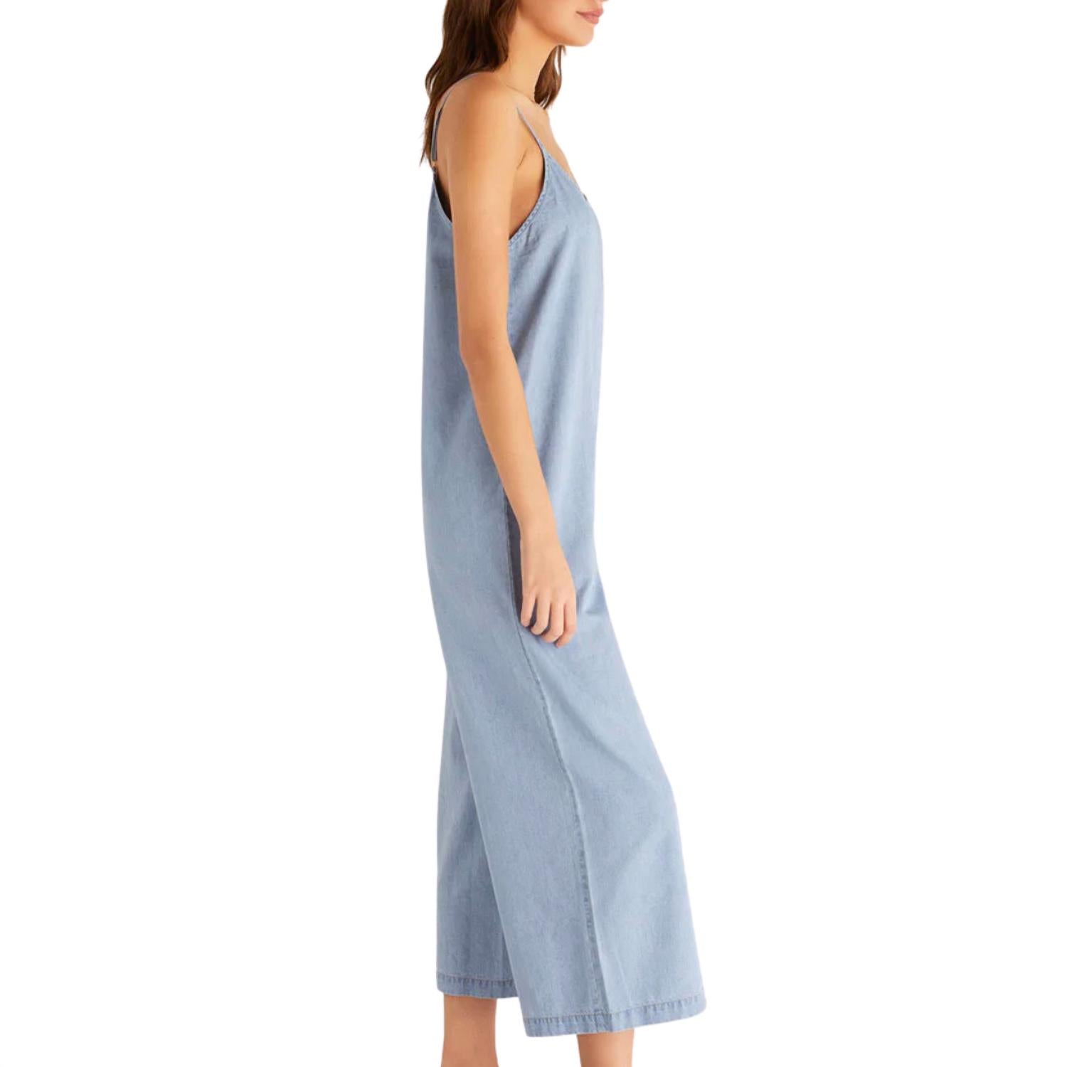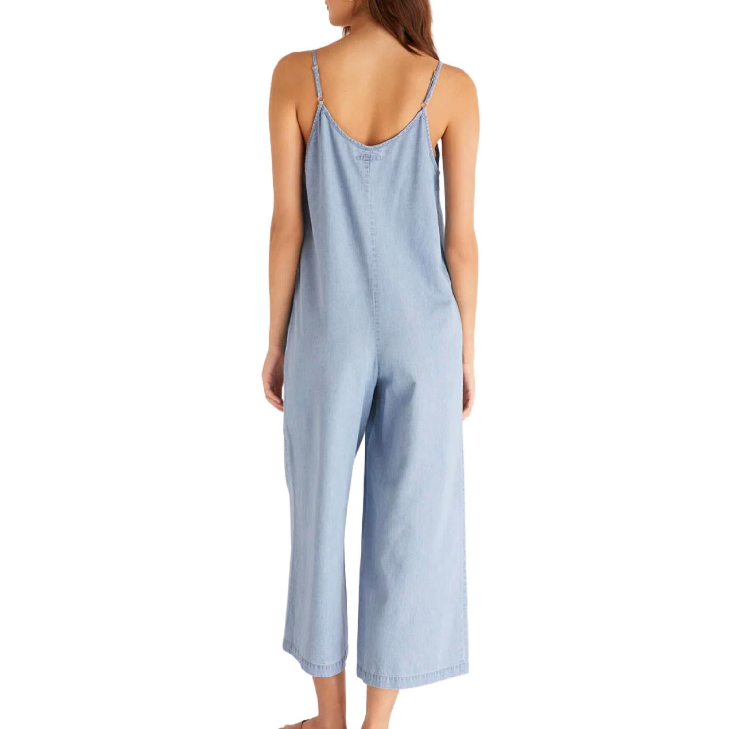 Throw it on and go! Z Supply Long Walks Chambray Jumpsuit Cotton Lyocell Twill in Light Chambray Flared Jumpsuit Wide Leg Scoop Neckline Relaxed Fit Adjustable Spaghetti Straps Size S Measurements Bust 37.5" Inseam 25" Machine Wash Cold, Hang to Dry