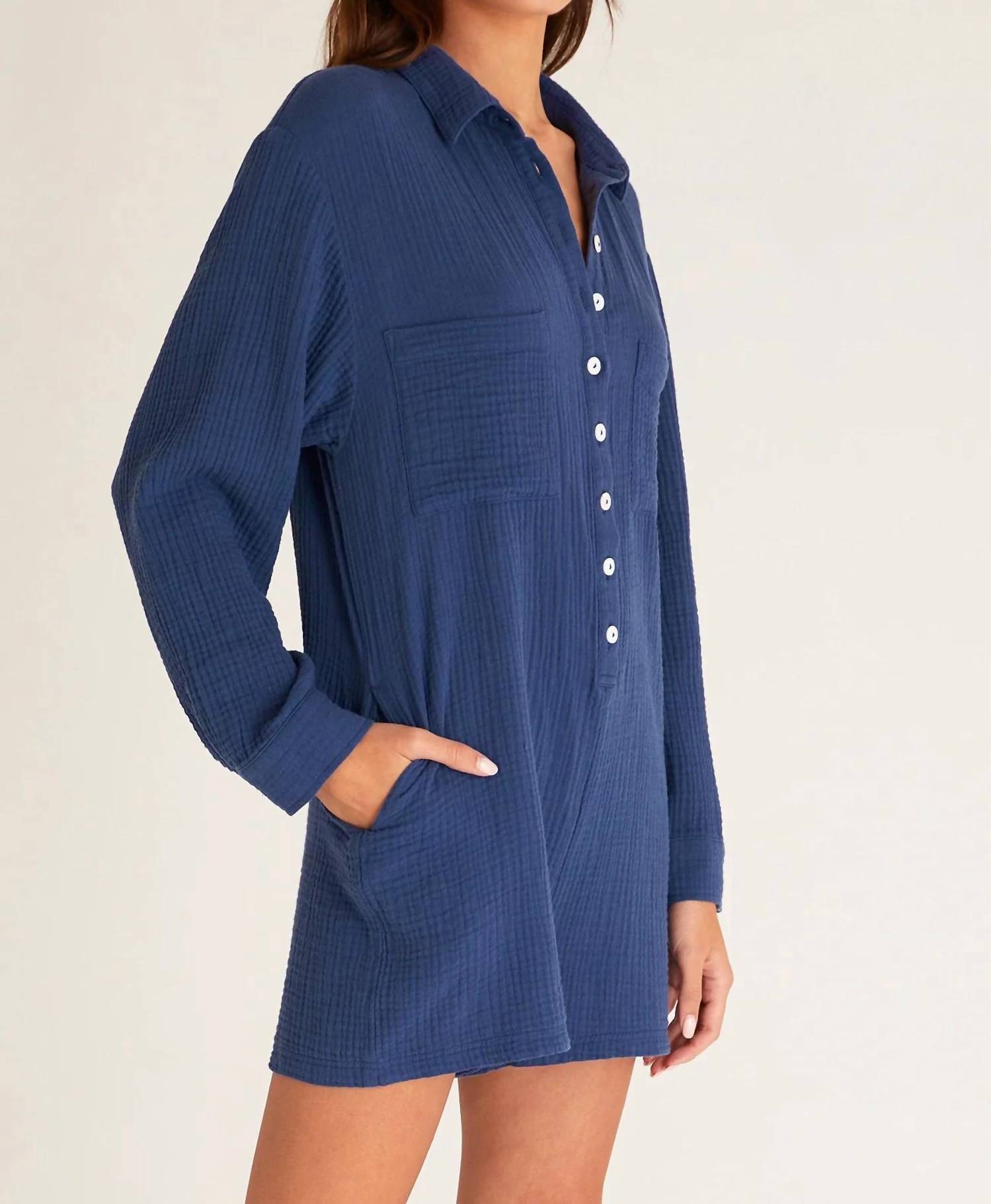 Throw it on and go! Lightweight, non-stretch crinkled gauze. Collared neckline and button placket. Long sleeve with button cuffs. Patch breast and on-seam hip pockets. Shell: 100% Cotton. Wash cold. Measurements from size XS - Inseam: 1.5in / 4cm.