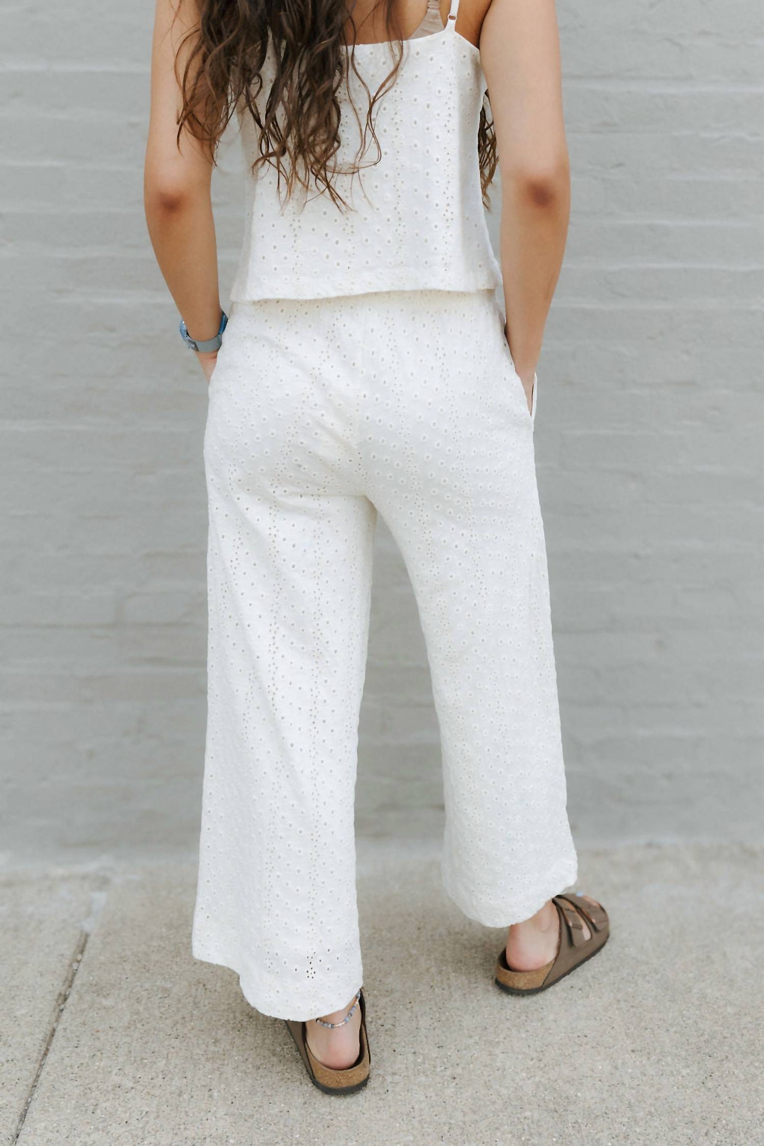 Meet the Romi Knit Eyelet Pants by Z Supply, your ideal summer companion crafted from 100% cotton for breathable comfort in a minimalist white. These straight-leg pants have a cropped length, featuring a high-rise fit with an adjustable drawstring for a customizable fit and convenient side pockets. They are designed for women who appreciate relaxed, wide-leg styles with a solid pattern, perfect for a beach day. With a pull-on closure for easy wear, care is a breeze—simply machine wash and tumble dry.
