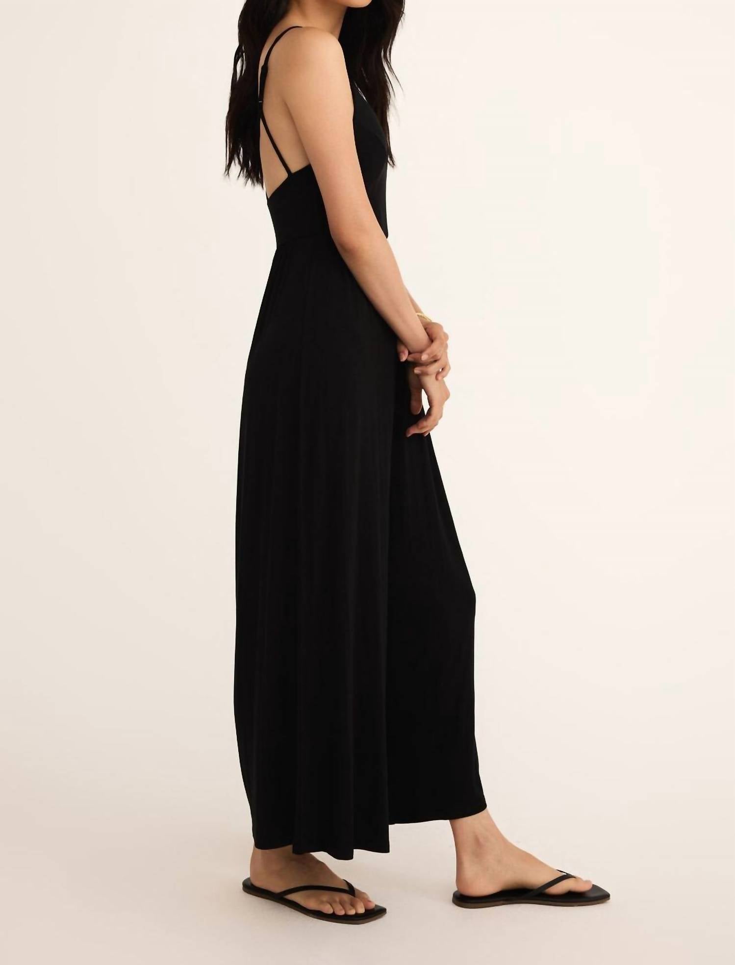 Elevate your date night look with the Roz Jumpsuit by Z Supply, a sophisticated piece perfect for dinner parties. This black one-piece boasts a fitted bodice with criss-cross straps, sitting elegantly at the high waist to flatter your figure. Crafted from a soft rayon spandex sleek jersey composition of 95% Rayon and 5% Spandex, it offers both style and comfort. The wide leg design adds a stylish touch, making this jumpsuit a standout choice. Model is 5′9″ wearing a size S with measurements of 30" bust, 24" waist, and 34" hips.
