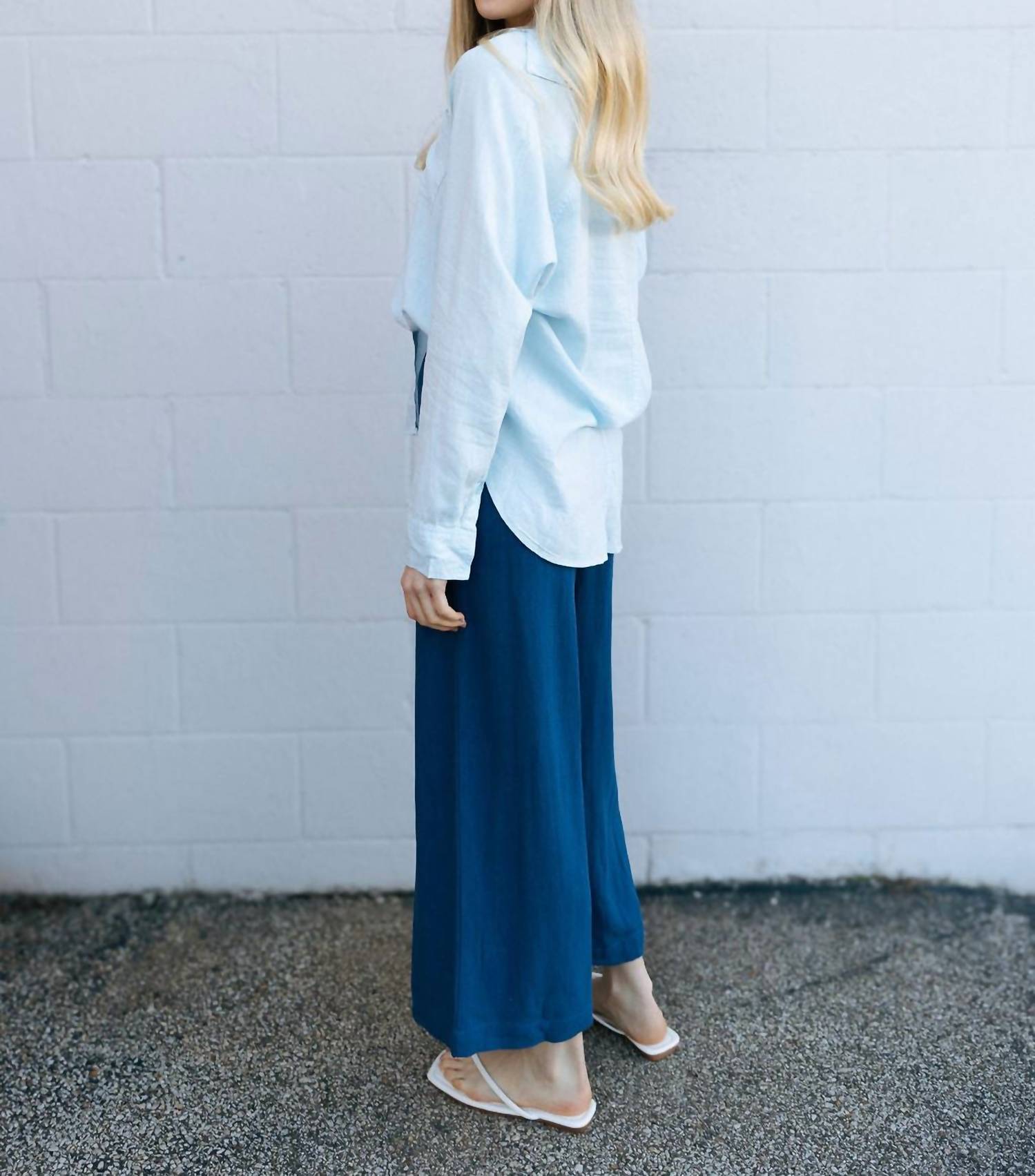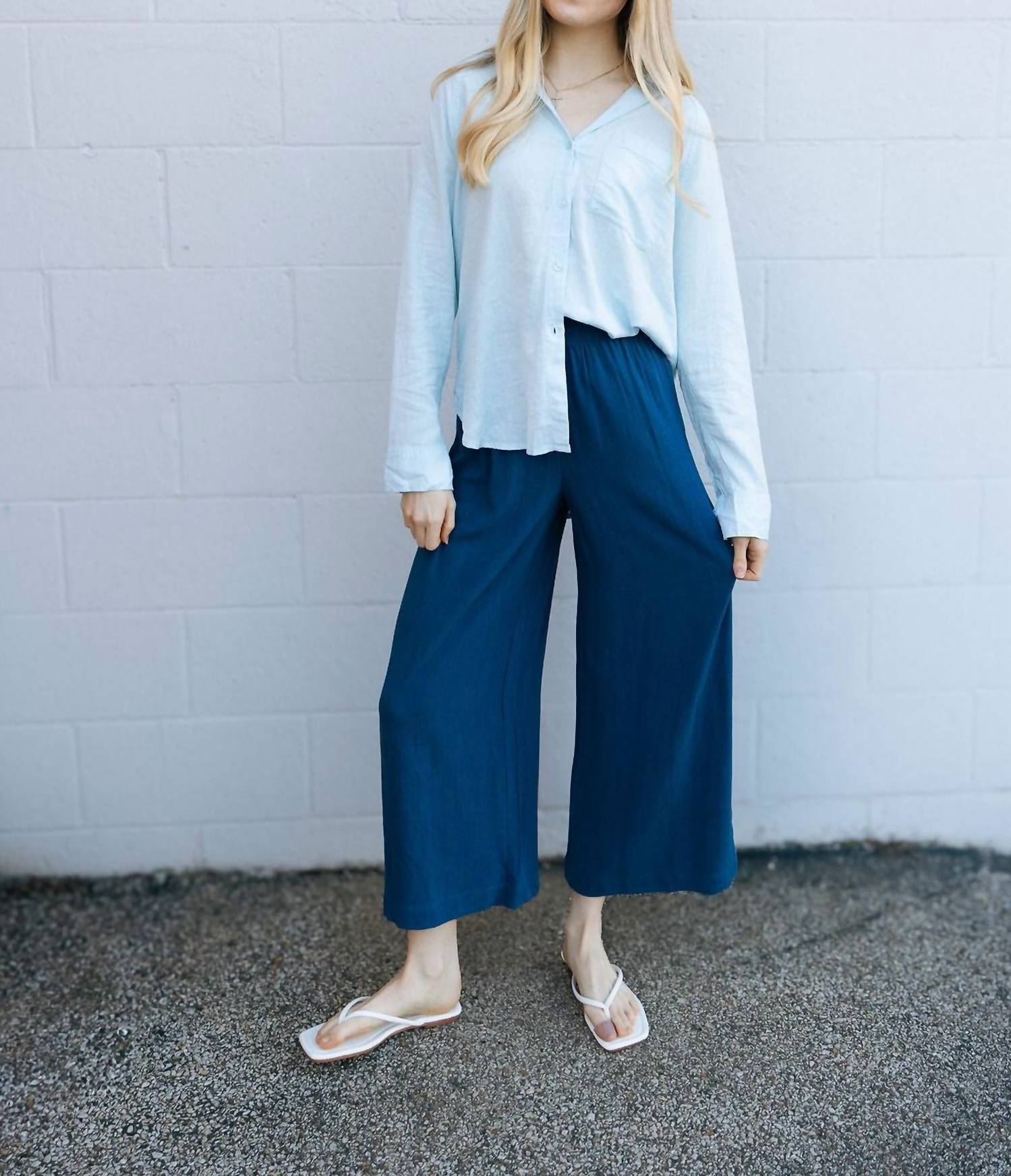Discover the Scout Linen Rayon Pant by Z Supply, a must-have for a relaxed beach look or casual lounging. These women's pants in solid blue feature a high-rise waist with a pull-on closure, ensuring ease and comfort. Composed of 86% rayon and 14% linen, the wide legged, cropped length design is perfect for summer days. Care instructions: machine wash and lay flat to dry. Dimensions for size XS: 26" inseam, 25.5" waist, 42.75" hip.