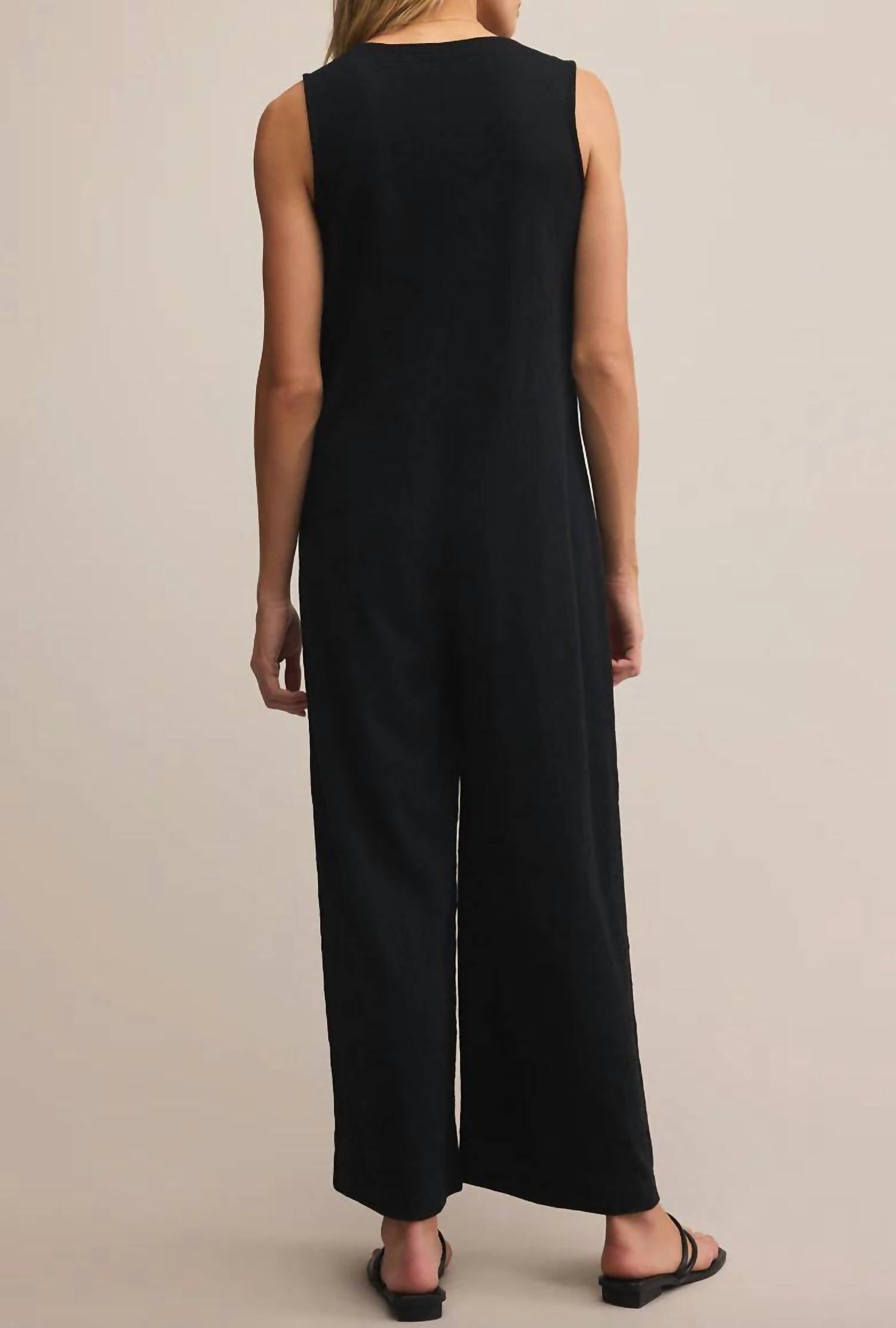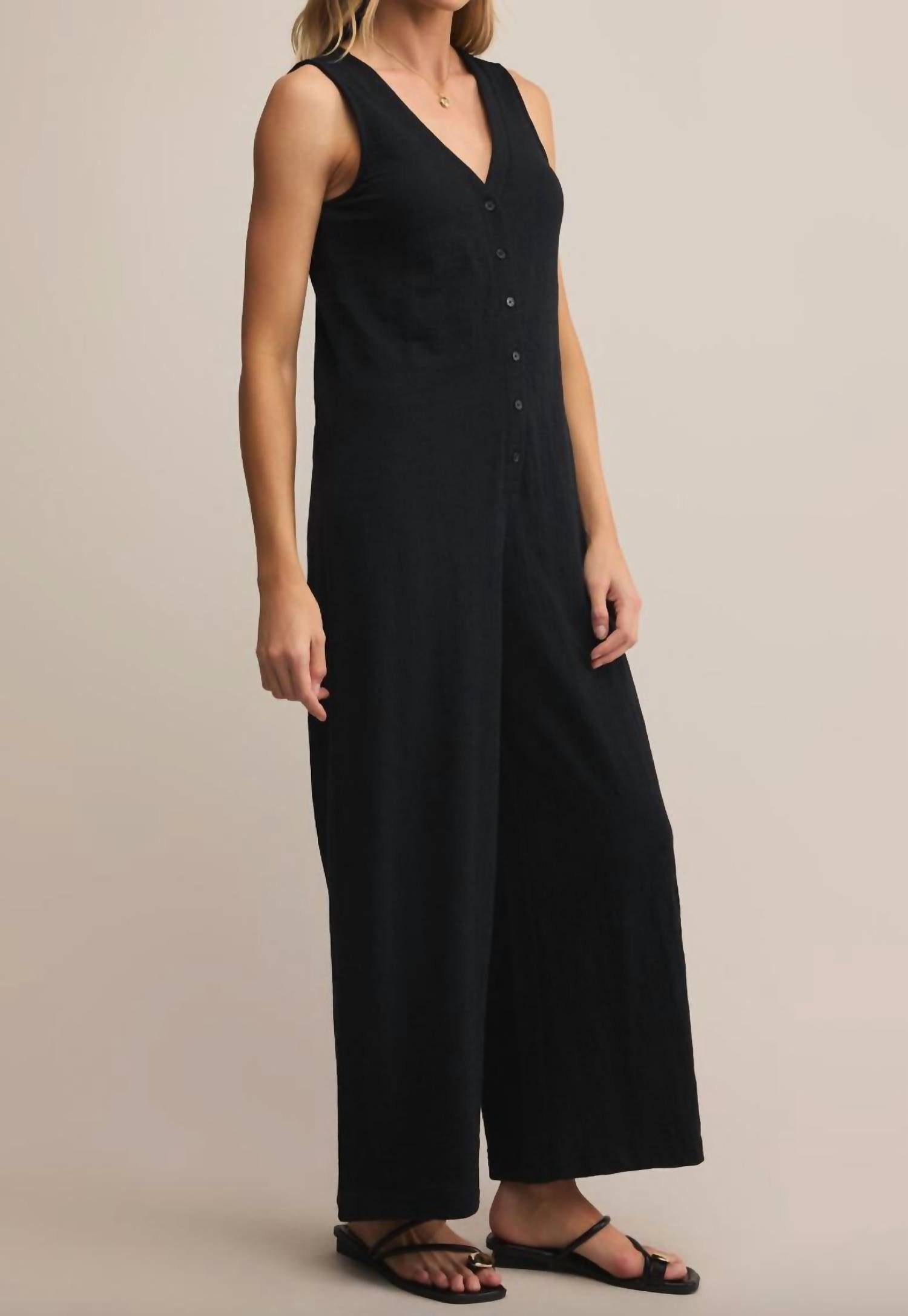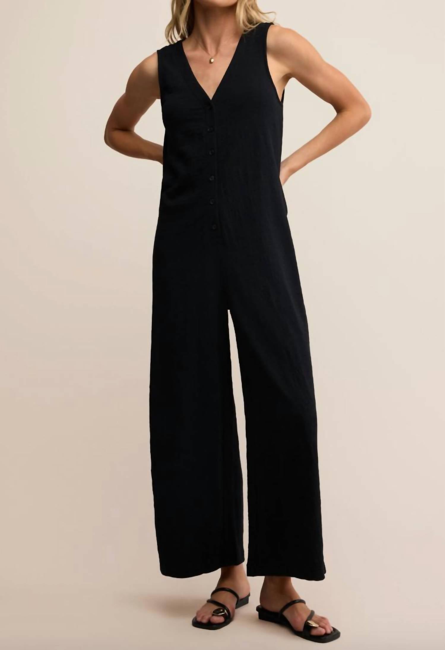 It doesn't take much for this one piece to look effortlessly cool. Add some statement jewelry to dress it up, or throw on some sneakers for a more casual vibe. Elevate your wardrobe with the Solace Jumpsuit by Z Supply, a perfect blend of comfort and style. This sleeveless jumpsuit features a flattering V-neck and an elegant button-front closure. The garment is made from a textured slub knit comprising 65% Polyester, 34% Cotton, and 1% Spandex, with a lightweight feel. Designed with an ankle-length straight leg, its 26-inch inseam adds a breezy touch ideal for summer vacation wear. Complete with convenient pockets, the jumpsuit is easy to care for with machine wash and tumble dry instructions, and offers a monochrome look perfect for any occasion.