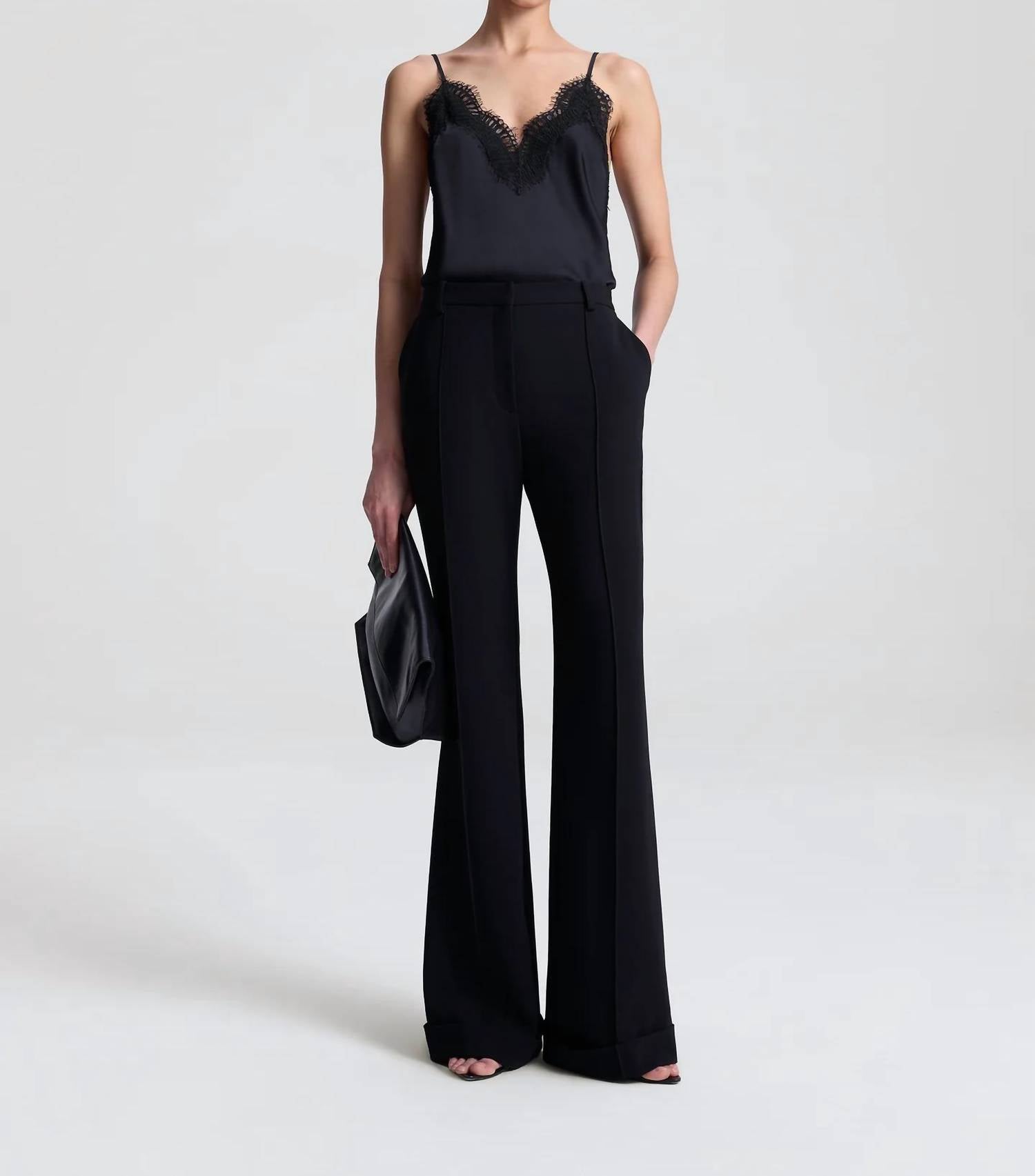 A slim trouser cut from woven fabric with structured yet fluid drape, designed with a mid waist, pin tuck crease, and floor-length cuffed hem that falls to a subtle flare.