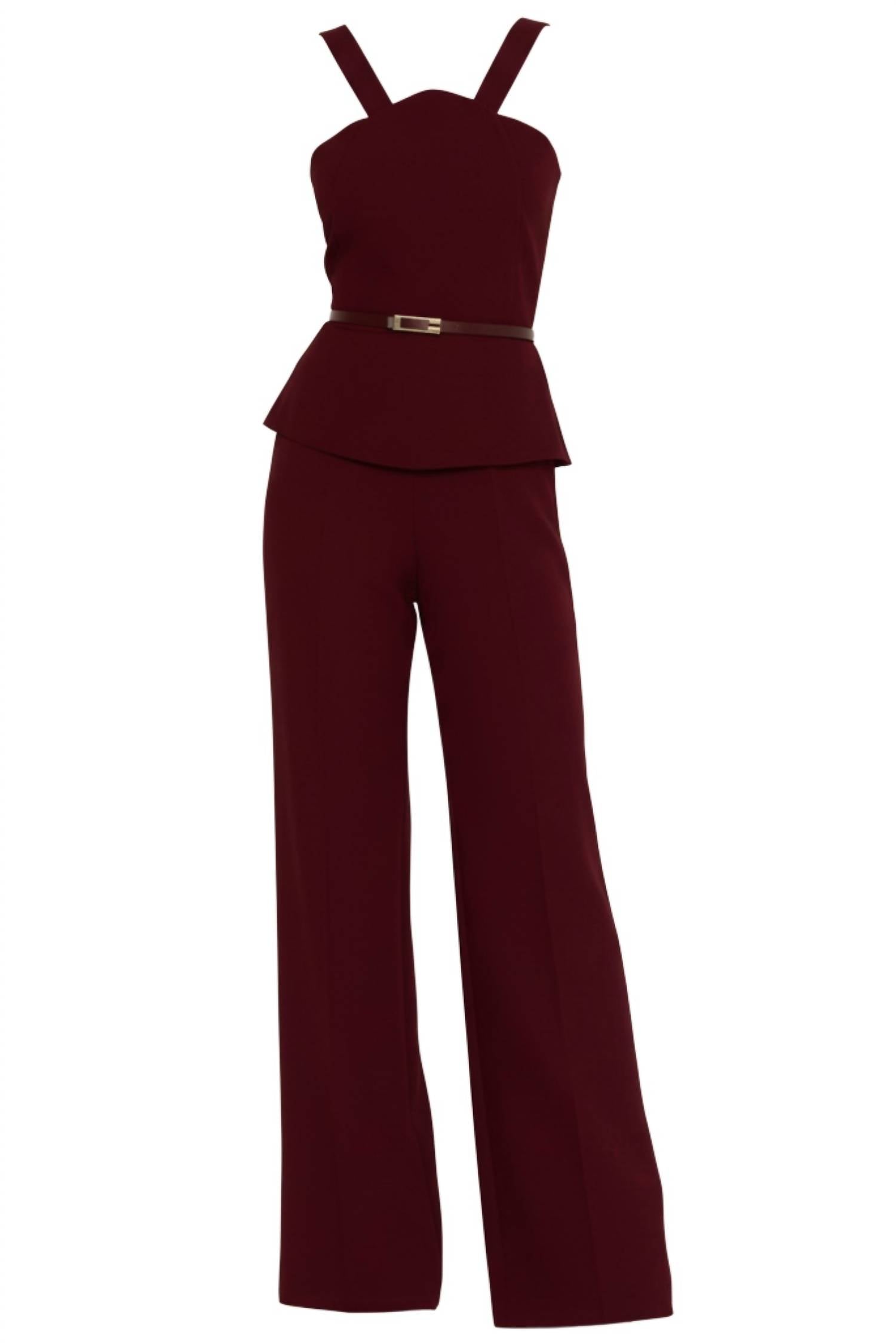 Throw it on and go! Meet the Ingrid Jumpsuit by Akalia, a stunning piece that combines contemporary elegance with a sophisticated silhouette. This sleeveless, halter design boasts a dramatic peplum waist and an elegant belt with a gold buckle. Made from a blend of 68% polyester, 29% viscose, and 3% spandex, with a 100% cotton lining, it provides both comfort and style. It features a pull-on closure and is crafted in Europe, making it a perfect choice for holiday parties. Care: Cold hand wash.