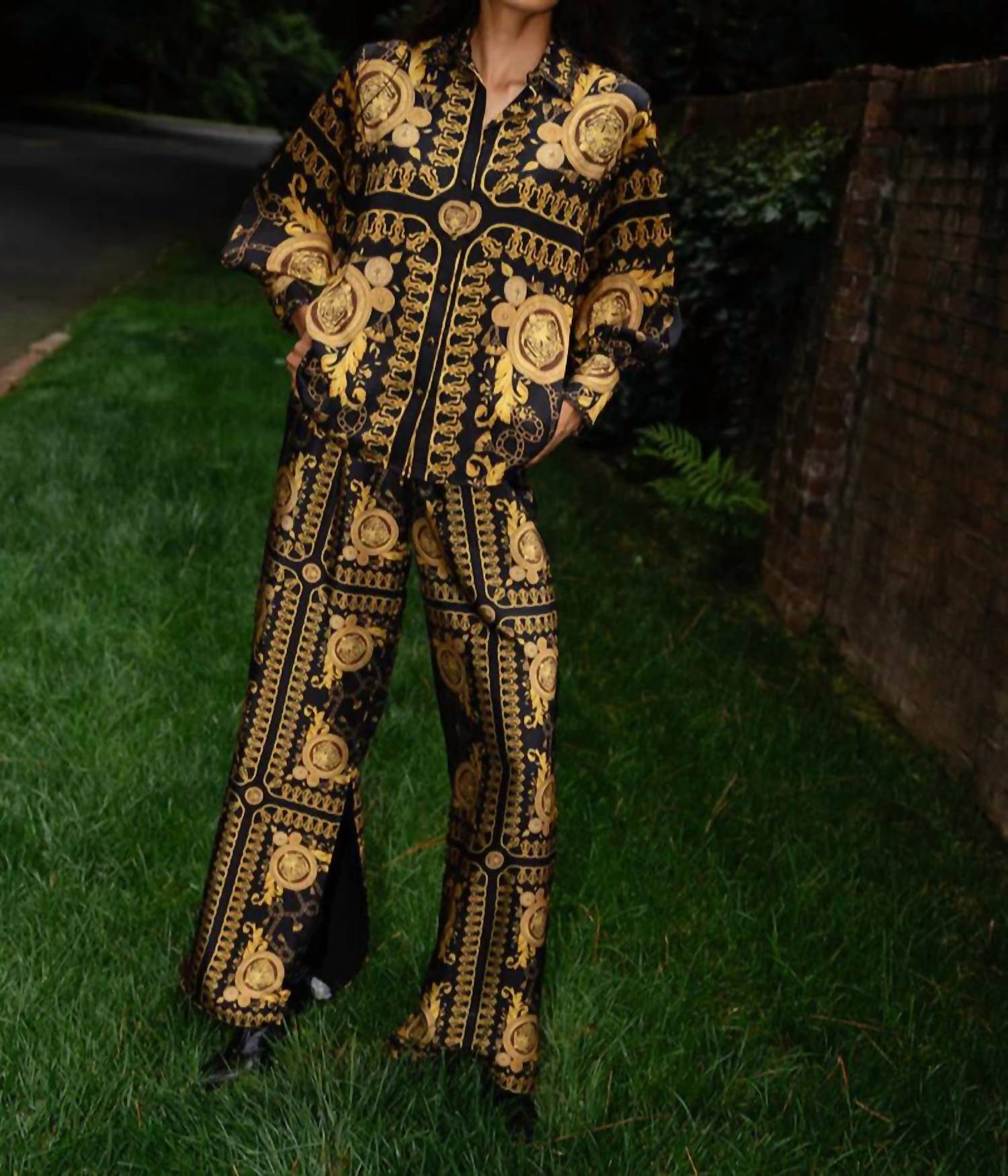 Introducing the Penny Pull-on Pant by Alden Adair in the captivating Donatello print, perfect for your summer vacation wardrobe. These high-rise, relaxed fit, wide-leg pants boast a graphic pattern, making them the ideal boho chic statement piece. Crafted from 100% Polyester, they feature a convenient pull-on style with a comfortable elastic waistband and side slits. Made in China, they are easy to care for—simply machine wash cold and tumble dry low.