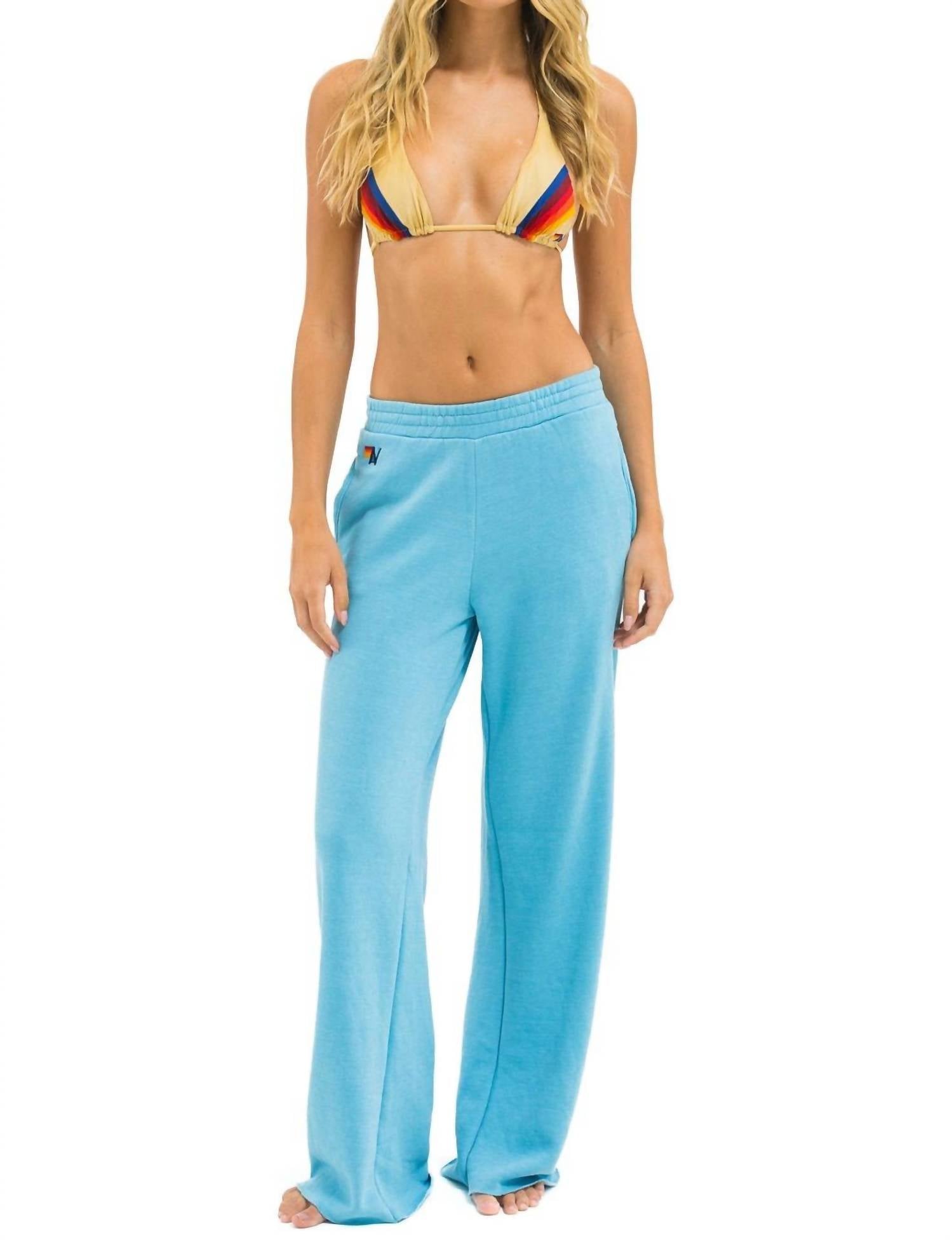 Pair these with your favorite sneakers for an effortlessly cool look. Experience unparalleled comfort with the Wide Leg Pocket Sweatpants by AVIATOR NATION in an eye-catching Aqua hue. Crafted from a tri-blend fabric of 50% polyester, 38% cotton, and 12% rayon, these pants feature a relaxed fit, mid-rise waist, and wide-leg silhouette, accented with a classic stripe pattern. Proudly hand-sewn in Los Angeles, they boast convenient side pockets and a raw edge bottom for a unique, vintage feel. Easy-care instructions include machine wash and tumble dry low, making these sweatpants as practical as they are stylish.