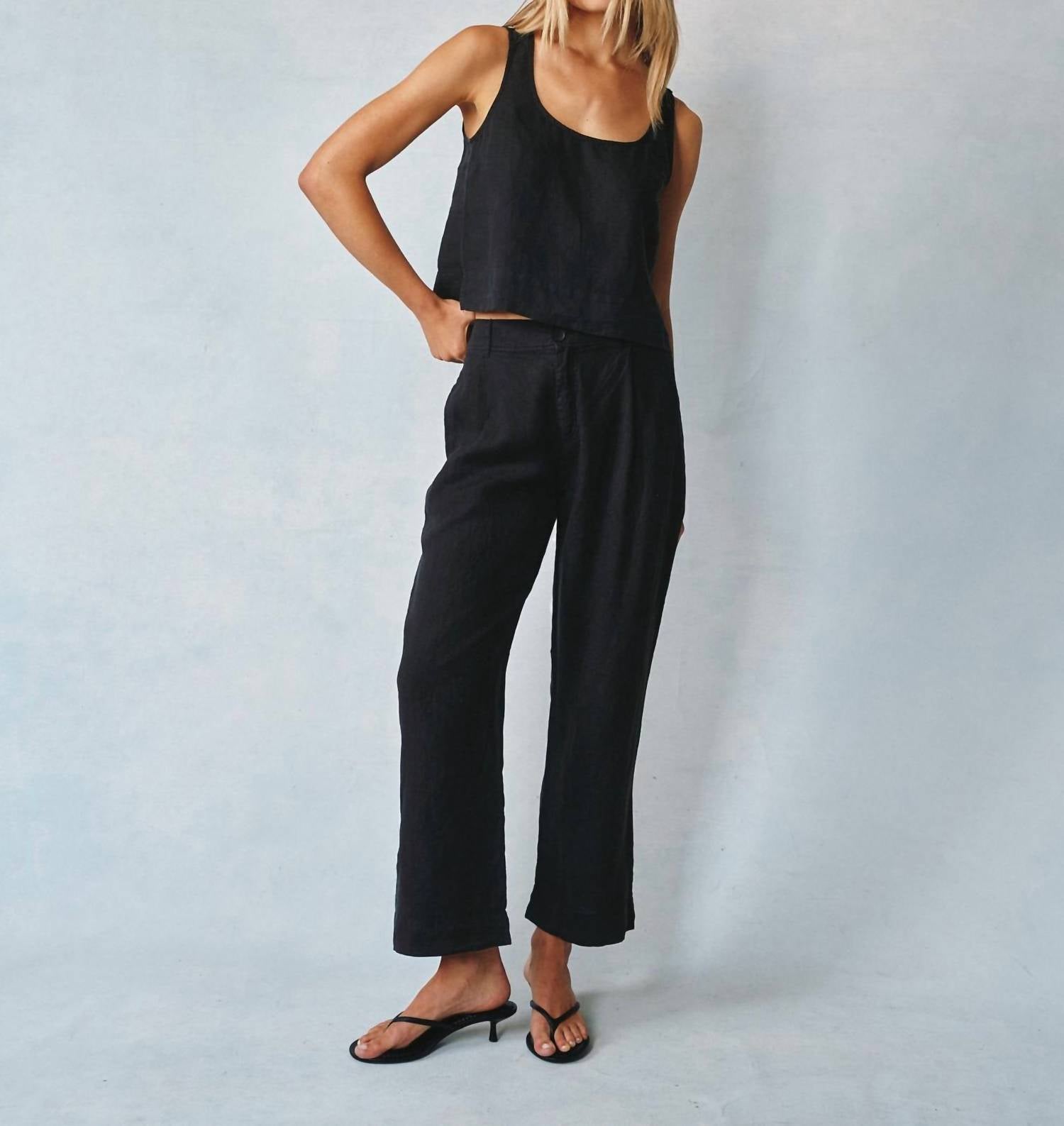 Upgrade your wardrobe with these cropped pants, designed to merge sophistication and wearability. The tailored fit ensures ultimate comfort during long days or nights out. Elevate your summer wardrobe with the Pleated Wide Leg Ankle Pant by Bella Dahl, now in a classic black hue. These high-rise, relaxed-fit trousers feature a minimalist wide-leg design, crafted from luxurious linen for ultimate comfort and a chic, timeless look. The trousers are equipped with pockets and offer a convenient pull-on closure style. For hassle-free maintenance, simply machine wash and tumble dry. Perfect for vacation or a stylish 4th of July celebration.