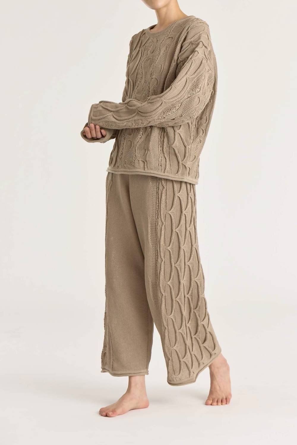 Discover the Cable Knit Pants in Taupe by Black Crane, exuding effortless elegance with a minimalist appeal. Crafted from 100% cotton, these wide-leg, high-rise trousers offer a relaxed fit and a uniquely textured, raised weave for distinctive style. Designed in Japan, they feature an elasticized waist and a dropped crotch, enhanced by rolled edge hem details. Please note these pants require dry cleaning, and the model is 5'6" wearing size S with measurements 32" chest, 24" waist, and 34" hip.