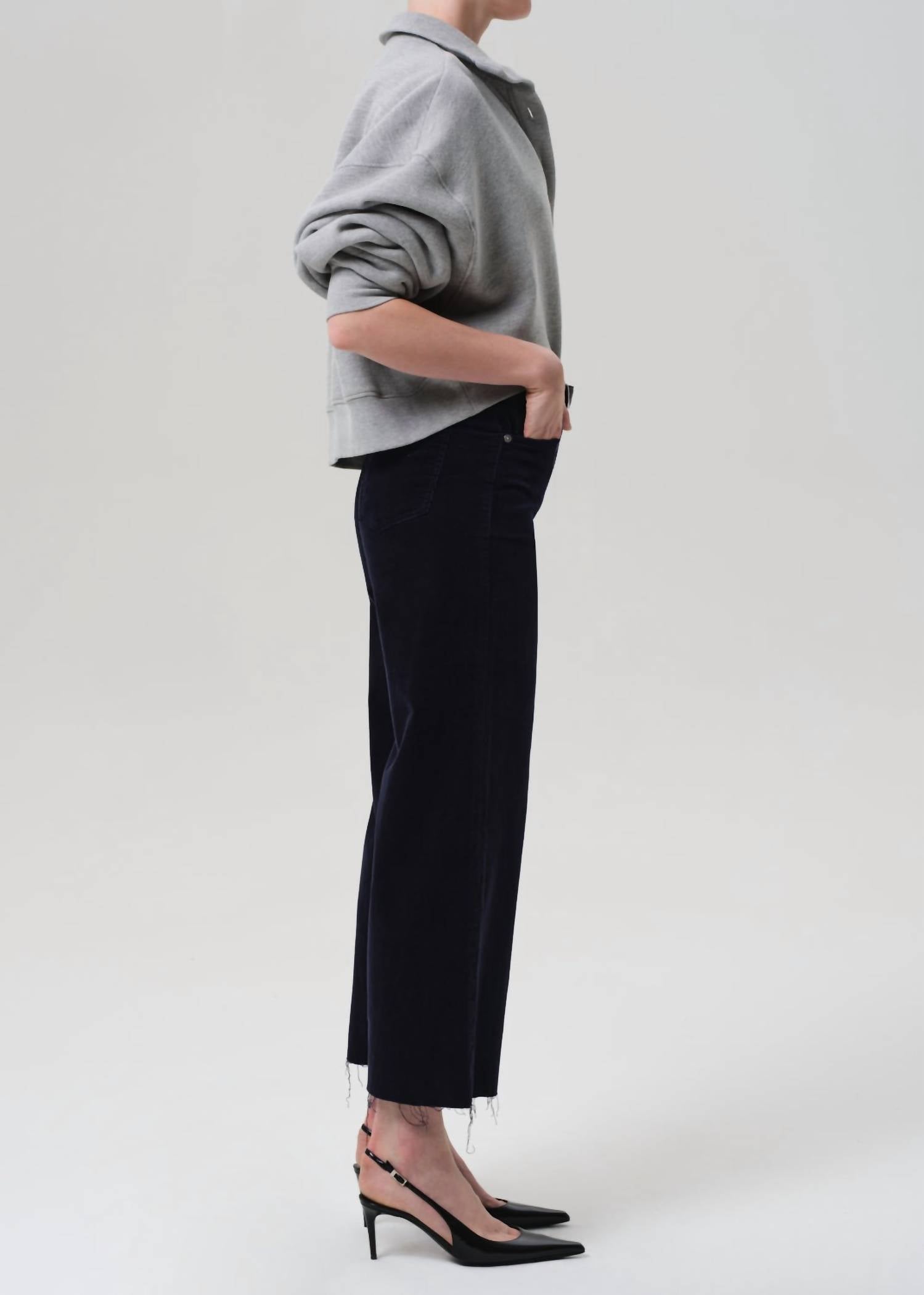 Experience the refined design of the Lyra Wide Leg Crop Corduroy by Citizens of Humanity, featuring a high-rise fit and wide leg silhouette in a dark navy hue. Crafted from a soft 98% cotton and 2% elastane blend, these vintage-inspired pants boast a modern cropped inseam measuring 27 inches, and a leg opening of 24.5 inches. Closure is secured with a zip fly while maintaining the elegant texture of the stretch baby corduroy. Made in the USA, these pants are easily cared for with a machine wash cold and tumble dry low instruction. They create an ideal look for both church gatherings and fall workwear occasions.