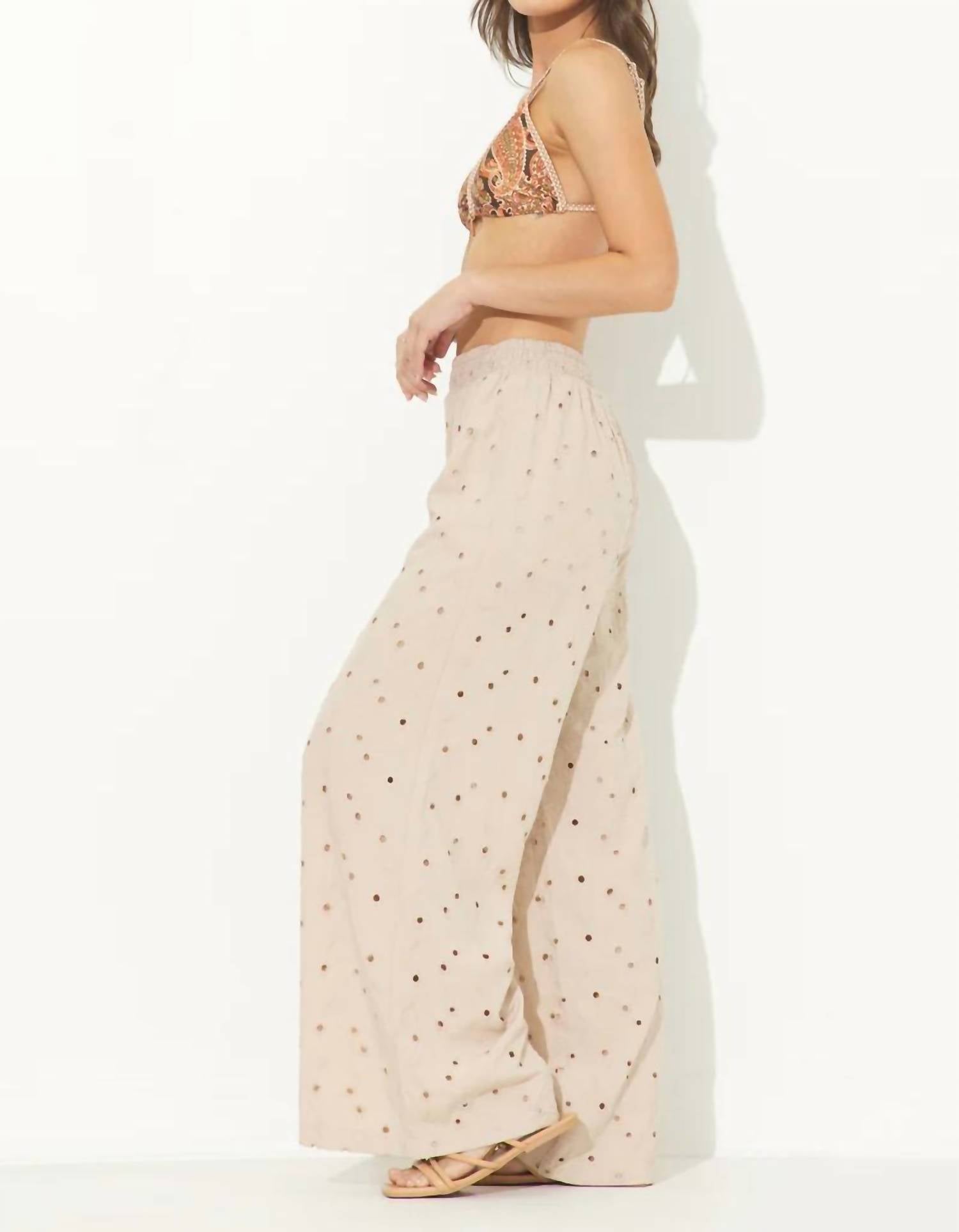 Embrace boho chic with the Floral Eyelet Wide Leg Pants by Ocean Drive, designed in the pleasant shade of Sandy Beach. With a relaxed fit and high-rise waist, these pants showcase a wide leg style and feature convenient pockets, perfect for a summer vacation. Made with eyelet patterned fabric, they offer a stylishly breezy feel that's effortlessly chic. Closure: Pull on.