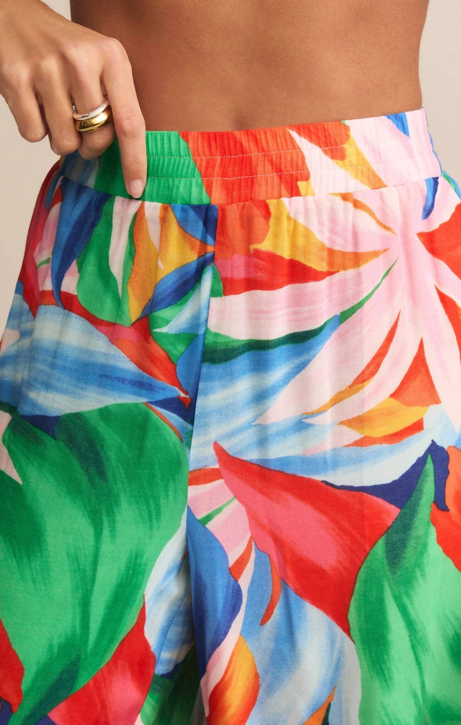 The Z Supply Dante Villa Pants are the ultimate athleisure piece for a summer beach day, showcasing a vibrant tropical floral print. Designed with a high rise and relaxed fit, these pants feature a pull-on elastic waistband and convenient side seam pockets for laid-back ease. Crafted from a lightweight cotton blend voile and fully lined with 100% rayon, they offer an effortlessly comfortable experience. Made under fair conditions in a company-owned Chinese factory, these multi-colored wide-leg pants demand easy care: machine wash and tumble dry.