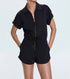 Introducing the Meg Zip Front Romper by PISTOLA in the chic color of Fade To Black, perfect for your next vacation or special occasion. With a relaxed fit and flared leg, this solid style features a convenient zip closure and a flattering drawstring at the waist for a cinched or relaxed look. Made from comfortable cotton, this romper offers a touch of stretch for easy wear. Care instructions are simple: machine wash and tumble dry.