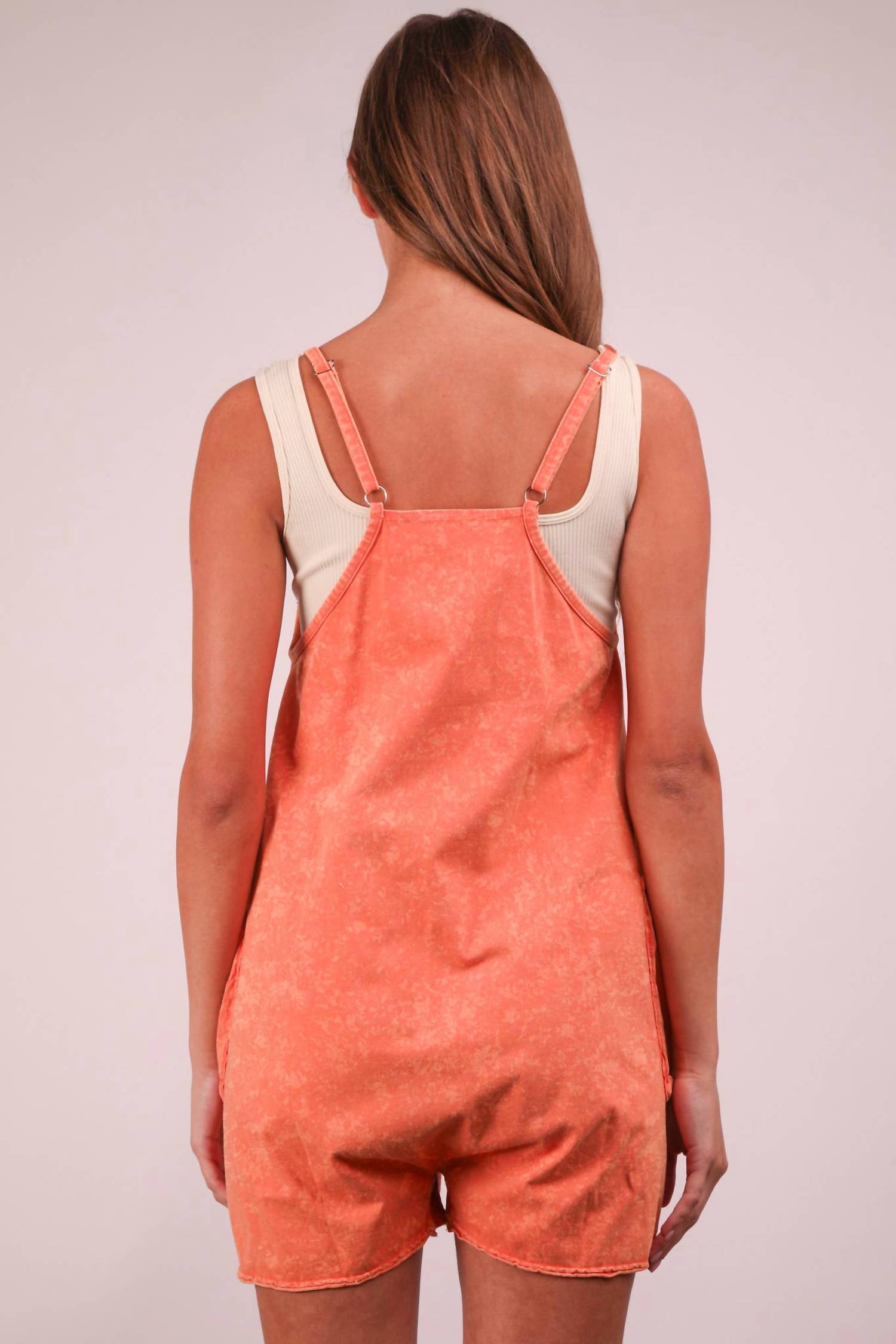 It doesn't take much for this one piece to look effortlessly cool. Add some statement jewelry to dress it up, or throw on some sneakers for a more casual vibe. Elevate your summer wardrobe with the Mineral Washed Sleeveless Casual Knit Romper by VERY J, a perfect choice for vacation and Y2K trends. Designed in a vibrant orange, this relaxed fit romper is crafted from 100% cotton, making it breathable for warm weather. It features a deep V-neck, raw edge detailing, bubble side pockets, and a pull-on closure. Origin: Imported. Care: Hand wash cold. With a short length of 32" and an inseam of 3", it's both stylish and comfortable. Model height: 5'8", wearing a Small.