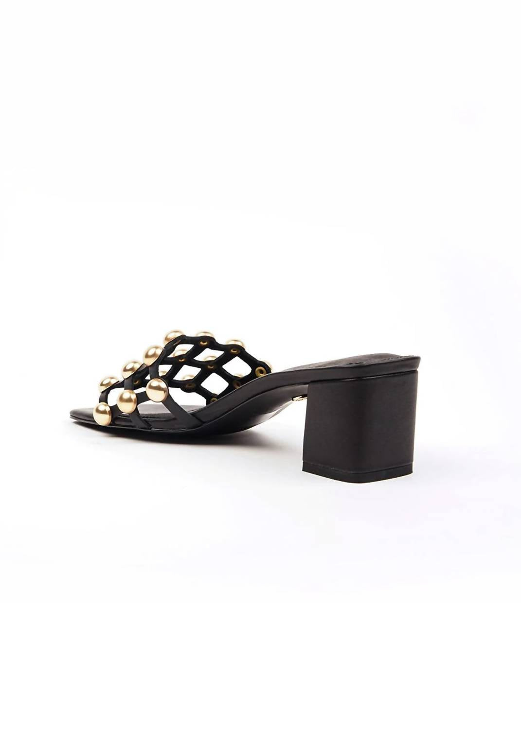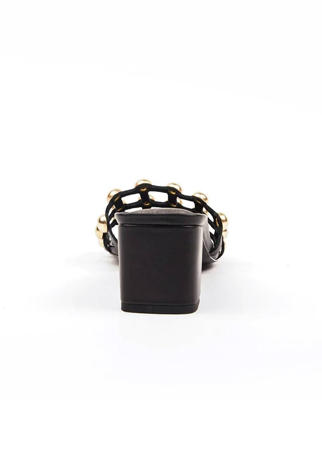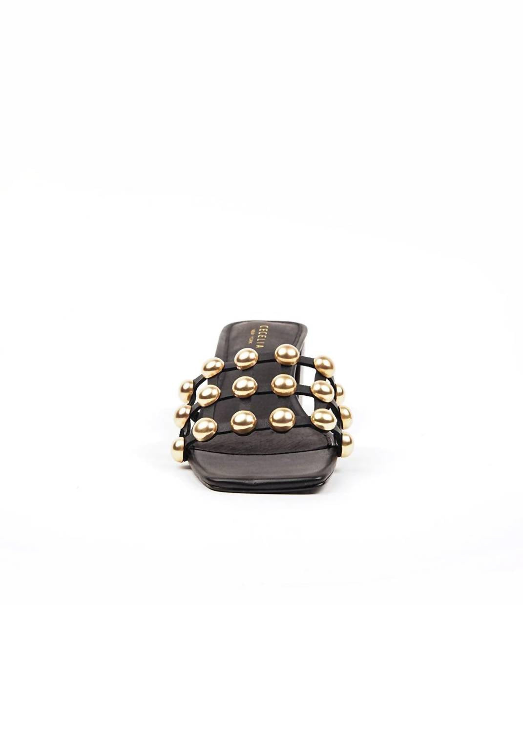 This sandal will take you from brunch to dinner and everything in between. Meet the Women's Beth Sandals by CECELIA NEW YORK, where style meets comfort in a sleek black and gold design. Crafted with a luxurious leather upper and lining, these slip-on sandals feature a statement square toe adorned with chunky gold studs. The leather-wrapped block heel stands at 2.5 inches, supported by a 4 mm padded footbed for added comfort. Ideal for the fashion-forward woman, these sandals promise both durability and elegance.