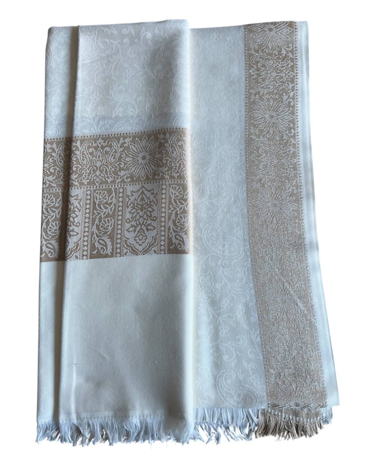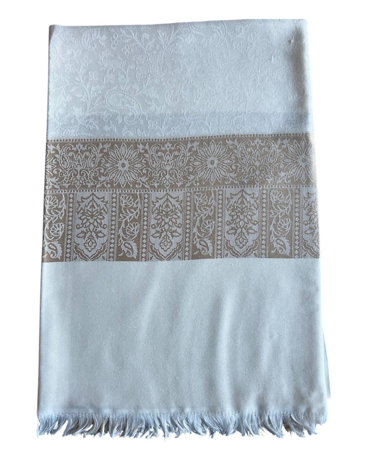 Timeless accessory that defines elegance with its intricate floral patterns and ornate borders. Crafted from premium jacquard and luxuriantly soft, breathable modal fabric. Lightweight yet cozy, suitable for all seasons. Expertly woven design features soft fringes for a refined finish, enhancing its regal charm. Heirloom-worthy piece designed to be cherished for years to come.