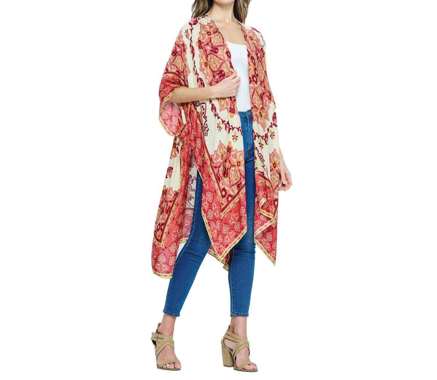 Embrace a boho chic look with the Boho Floral Mandala Kimono Wrap by Yak & Yeti. This maroon piece boasts a loose fit with lightweight viscose for effortless wear and comfort. Its half sleeves and open front design are complemented by a trendy floral mandala print and side slits for added flair. Perfect for a flowy casual style, this kimono wrap is a must-have for any wardrobe.