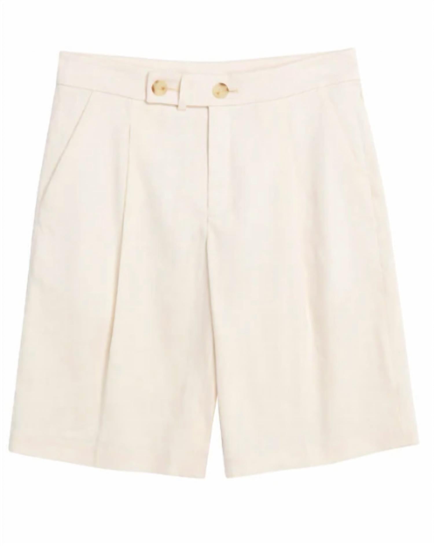 Discover the ultimate warm-weather essential with these stylish women's Bermuda shorts, skillfully crafted to provide a harmonious fusion of fashion and function.The Nico Short is made from a stretch cotton-linen blend in off-white. It features a pleated design with a knee-grazing length, mid-rise, and double-button waist. Includes side slash pockets and back welt pockets. Made from 65% linen, 34% cotton, and 1% elastane, it has a 9" inseam and 11.625" rise. Dry clean only; not lined. The model is 5'10" and wears a Size 4. Bust 31", Waist 23", Hips 34".