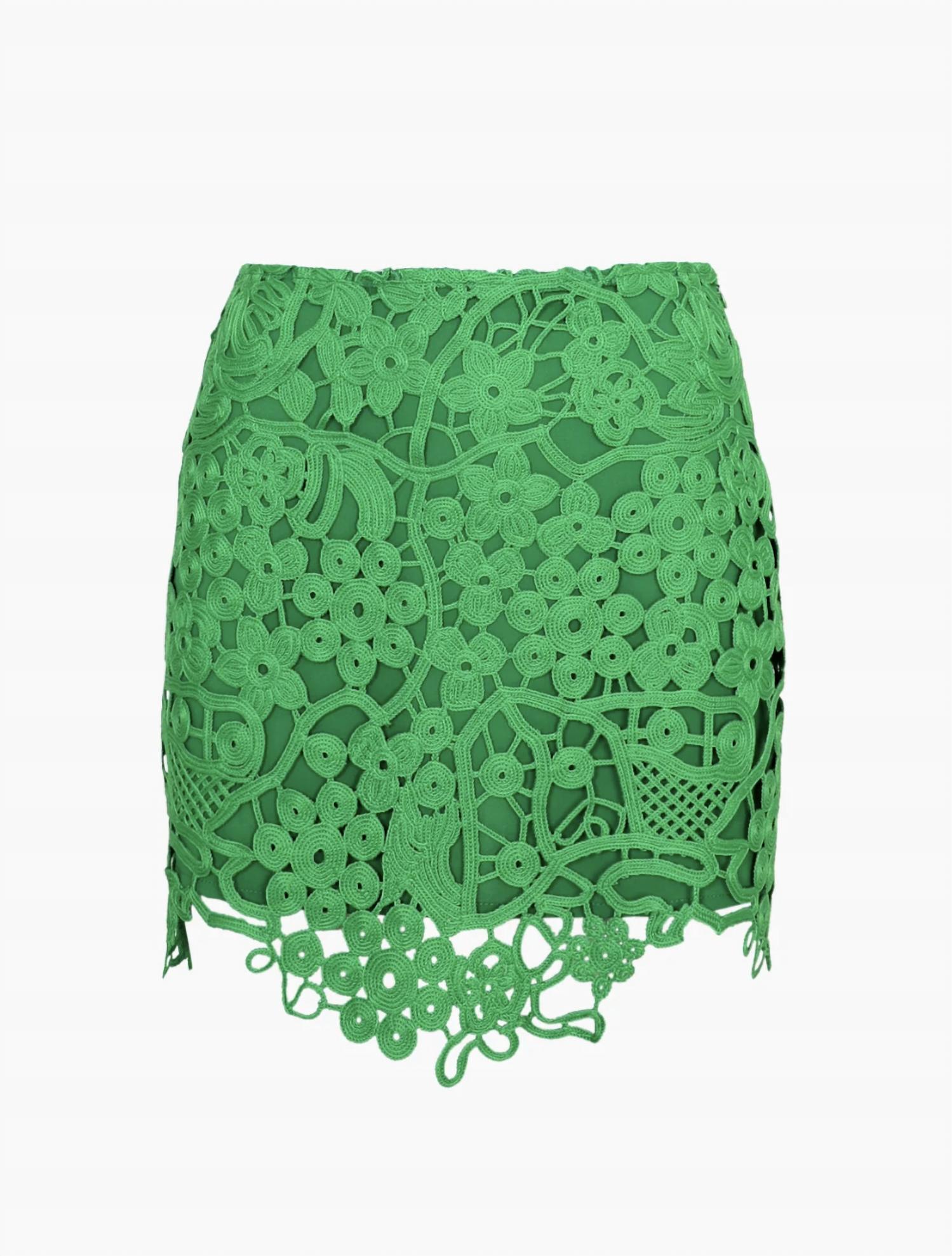 The Women's Janine Crochet Lace Eyelet Mini Skirt by Adelyn Rae is perfect for adding a pop of color to your summer streetwear collection. Crafted entirely from polyester, this mini skirt in a vibrant green hue features an abstract hemline and a side zipper closure for a sleek fit. With a garment length of 18.25 inches and a waist of 13.75 inches, it is designed to make a statement on your next vacation. Please note that due to the unique scalloped fabrication, the hemline pattern may vary.
